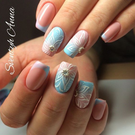 Après que tous les ongles soient décorés, nous attendons leur séchage complet. Nettoyez délicatement la cuticule et la peau du vernis en utilisant un liquide spécial et un coton-tige ou une brosse. Nous couvrons les ongles avec une couche de revêtement supérieur. Si vous le souhaitez, à ce stade, vous pouvez ajouter un décor sous la forme d'un petit strass ou de perles. Une manucure élégante et douce est prête.
