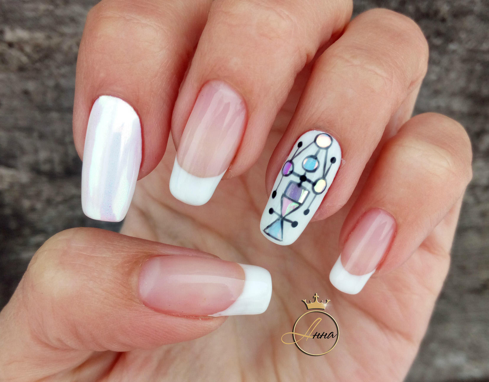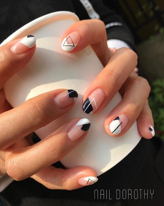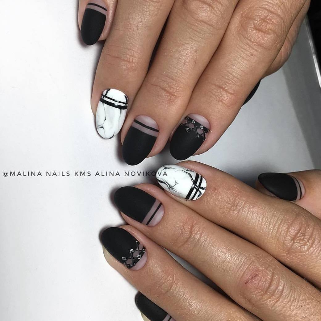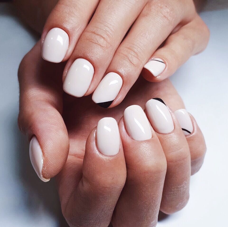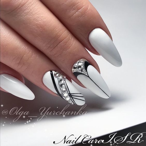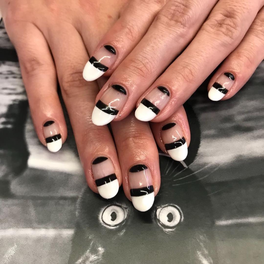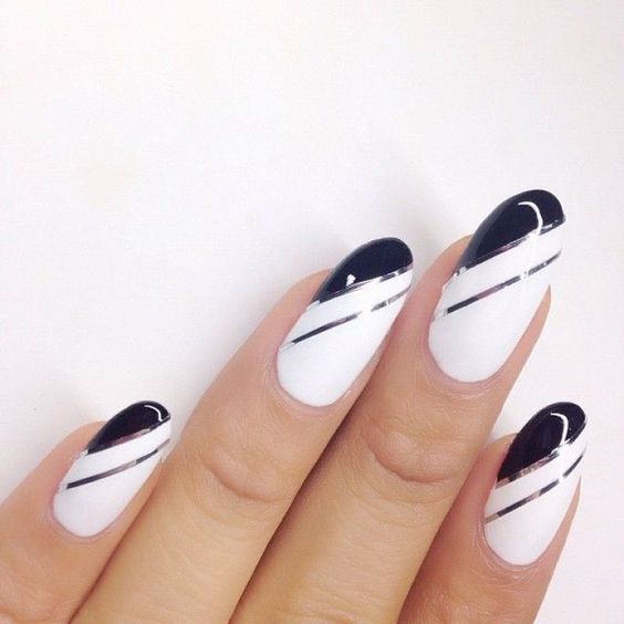 Si vous souhaitez diversifier votre manucure en noir et blanc, essayez d'appliquer un revêtement noir et mettez en surbrillance la ligne du sourire en blanc. Est-ce une solution inhabituelle? Magnifiquement, cette technique d'application se penchera sur plusieurs clous et de manière très originale dans la technique de la géométrie complexe. Soulignez le sourire avec des doubles lignes blanches, ajoutez des cailloux mousseux et le tour est joué - le design unique est prêt! Une autre option pour cette conception est la veste "déplacée". Nous soulignons la lune à la base avec une ligne blanche idéale, et le complément parfait au style ou à la coiffure rétro est prêt.
