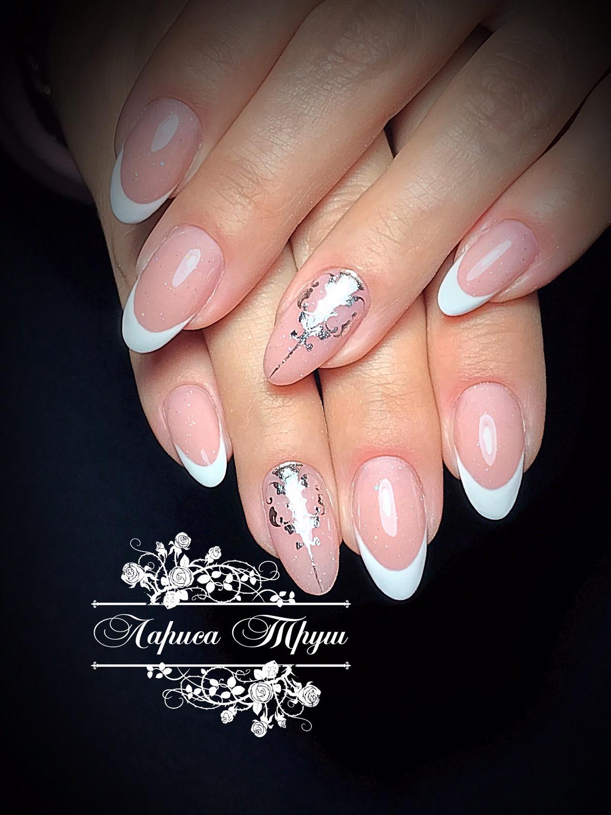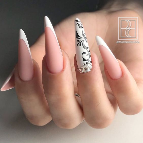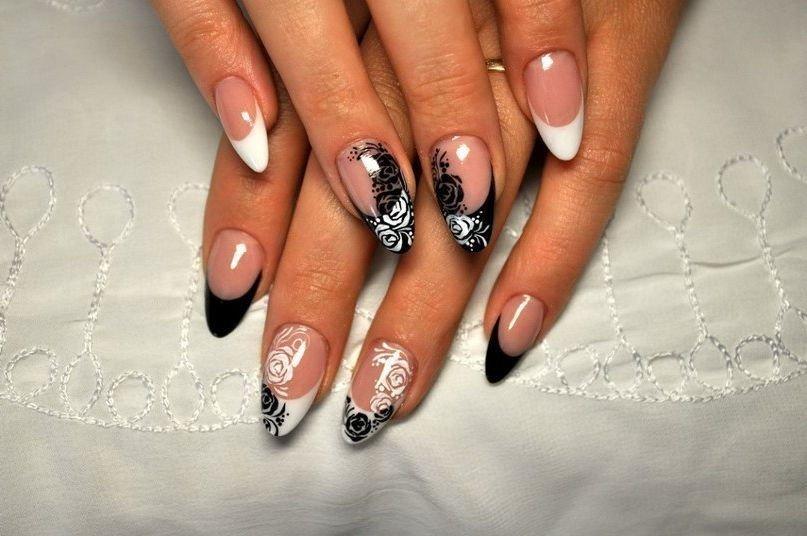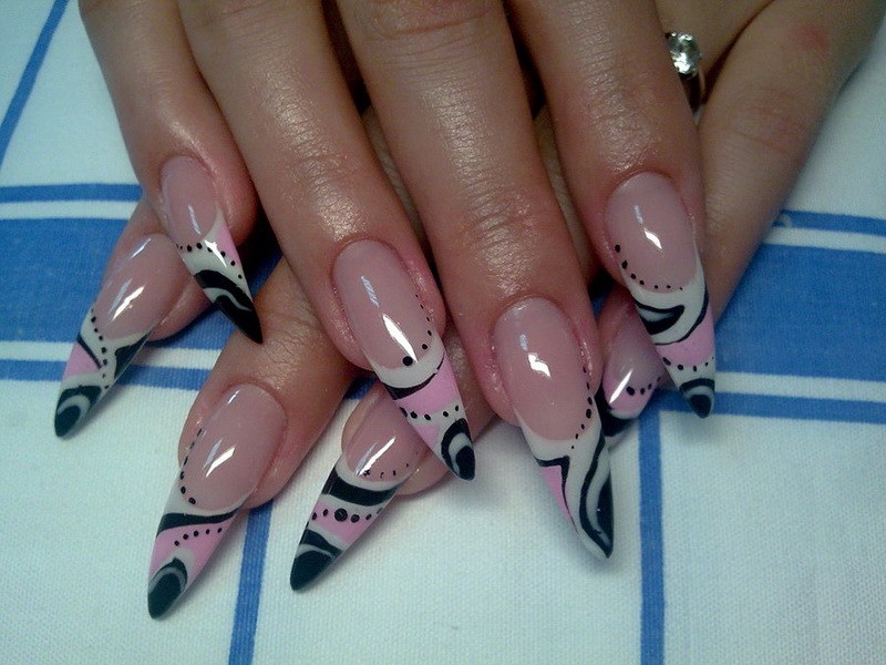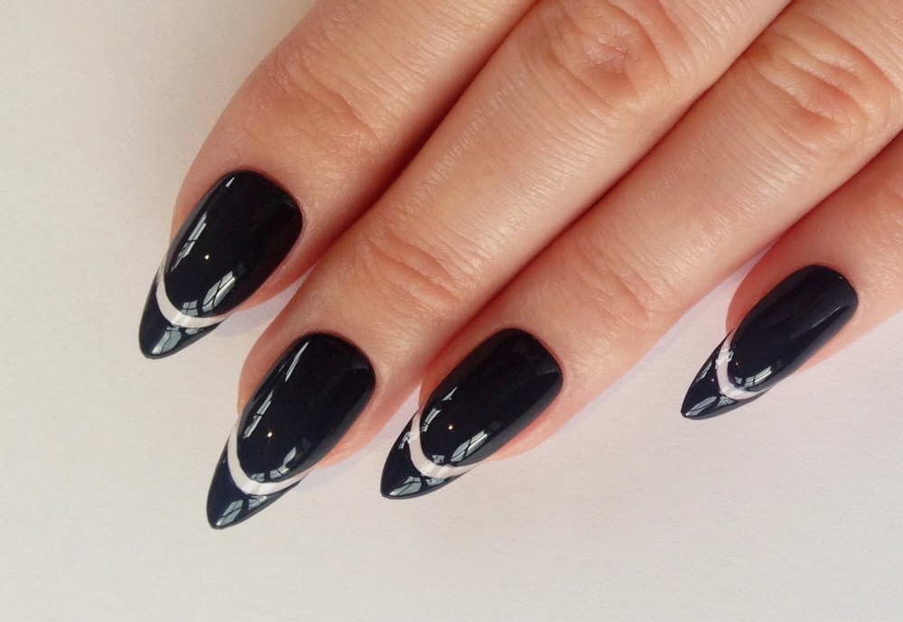Toutes les femmes ne préfèrent pas la forme aiguë des ongles. Considéré comme peu pratique et peu pratique, il occupe tout de même une position de leader dans le monde de la mode. Les clous pointus ont leurs fans qui admirent leurs ongles et créent leur design inhabituel. Pour souligner et souligner cette forme, les maîtres de salon suggèrent d’utiliser une veste française noire et blanche. Ces soucis avec une bande blanche au-dessous du milieu de la plaque ont l’air très extravagant. En outre, de minces sourires blancs sur le bord ou un large sourire presque au milieu de l'ongle, en forme d'arc, sont considérés comme une excellente option. Les peintures ajourées, divers éléments décoratifs dans une application discrète, soulignent habilement le point culminant de votre manucure.