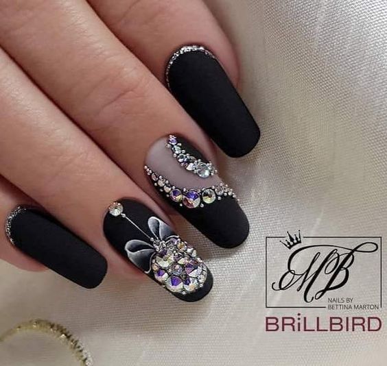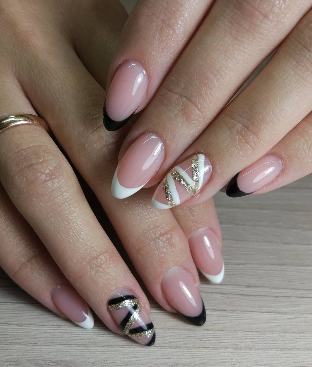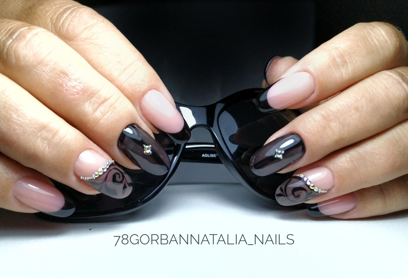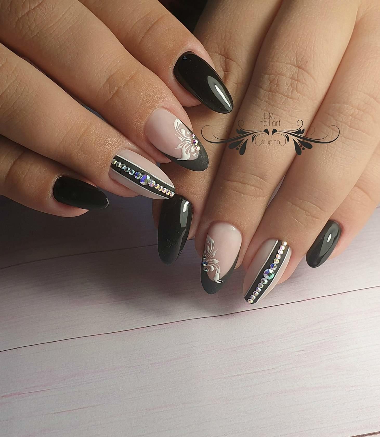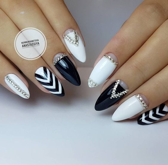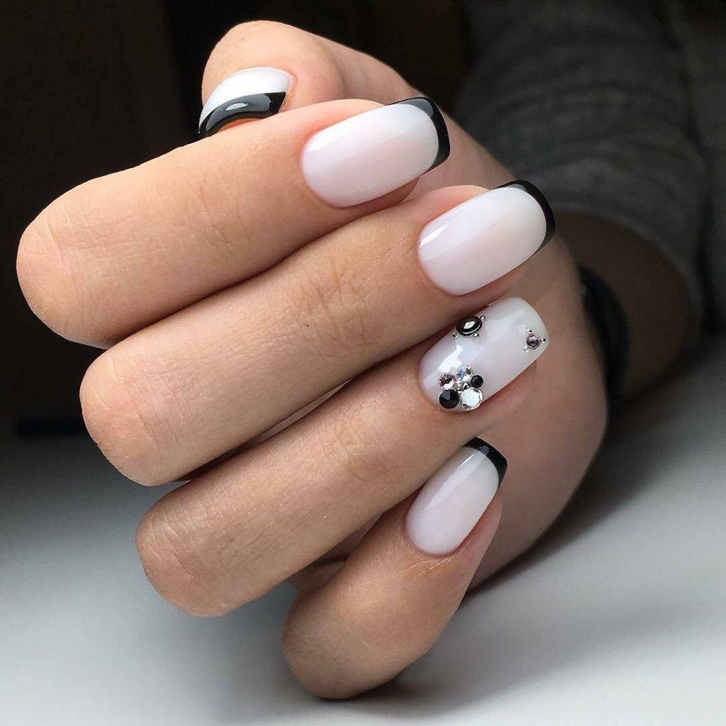La brillance et l’étincelle des strass ajouteront une originalité et des nuances de luxe à toutes les versions de manucure. Le français en noir et blanc ne fait pas exception. Les placers de pierres brillantes attirent l'attention sur vos ongles! Essayez d’utiliser des strass noirs dans votre manucure et ils vous émerveilleront avec leur éclat magique et envoûtant. Décorez la base de l'ongle ou la ligne d'un sourire et vous serez satisfait du résultat. Fabriquez une veste de manière géométrique et décorez les contours du revêtement avec des strass de couleurs opposées. Tout simplement génial!