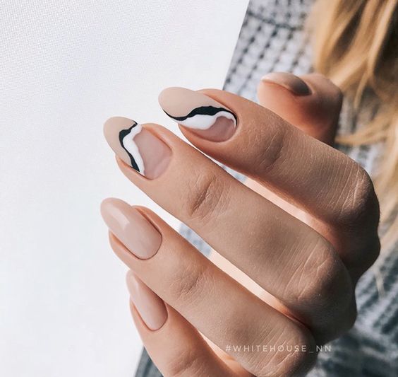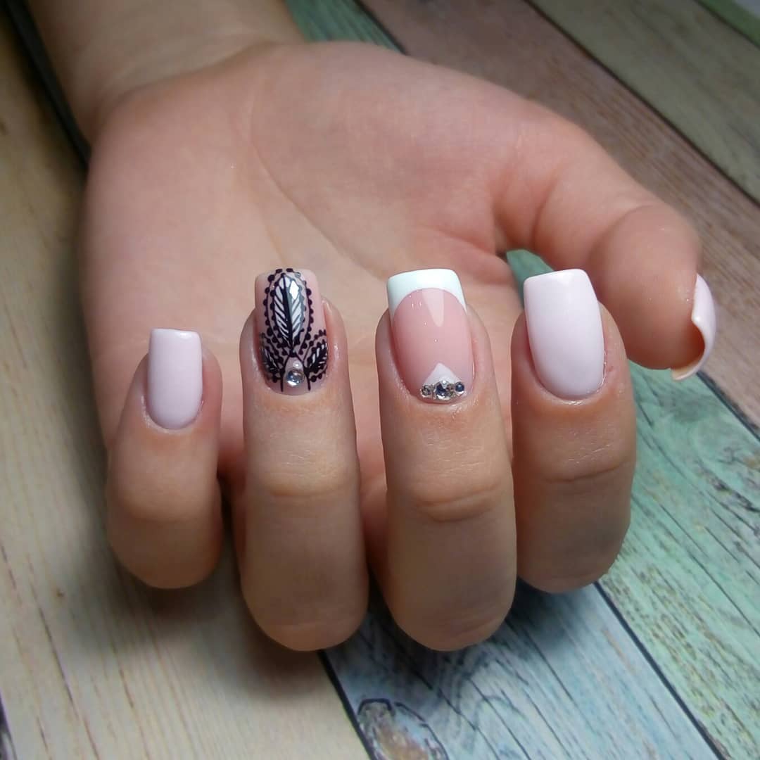 Une telle manucure peut être utilisée en toute sécurité pour divers événements et pour un usage quotidien. Il a l'air modeste et retenu. Pour diluer rigueur et modération, vous pouvez utiliser l’une des méthodes de décoration les plus chics: le dessin. Lorsque vous choisissez une image, faites attention à la variété des options. Des formes géométriques originales, des motifs floraux, des motifs de dentelle sur tous ou plusieurs ongles ajoutent une touche légère et sophistiquée.