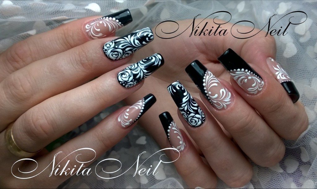 Les motifs floraux à l'image d'une femme soulignent toujours avec succès sa féminité. Pour donner une manucure stricte au romantisme et à la douceur, utilisez divers dessins sur des thèmes floraux. Appliquez des fleurs de différentes techniques et de différentes tailles. Les fleurs de couleurs vives conviennent parfaitement à une veste noire. Les fleurs seront spectaculaires dans le ton du revêtement choisi. Dans notre version, c'est noir et blanc. Vous pouvez appliquer des motifs floraux en tamponnant, en utilisant des autocollants ou des pochoirs.