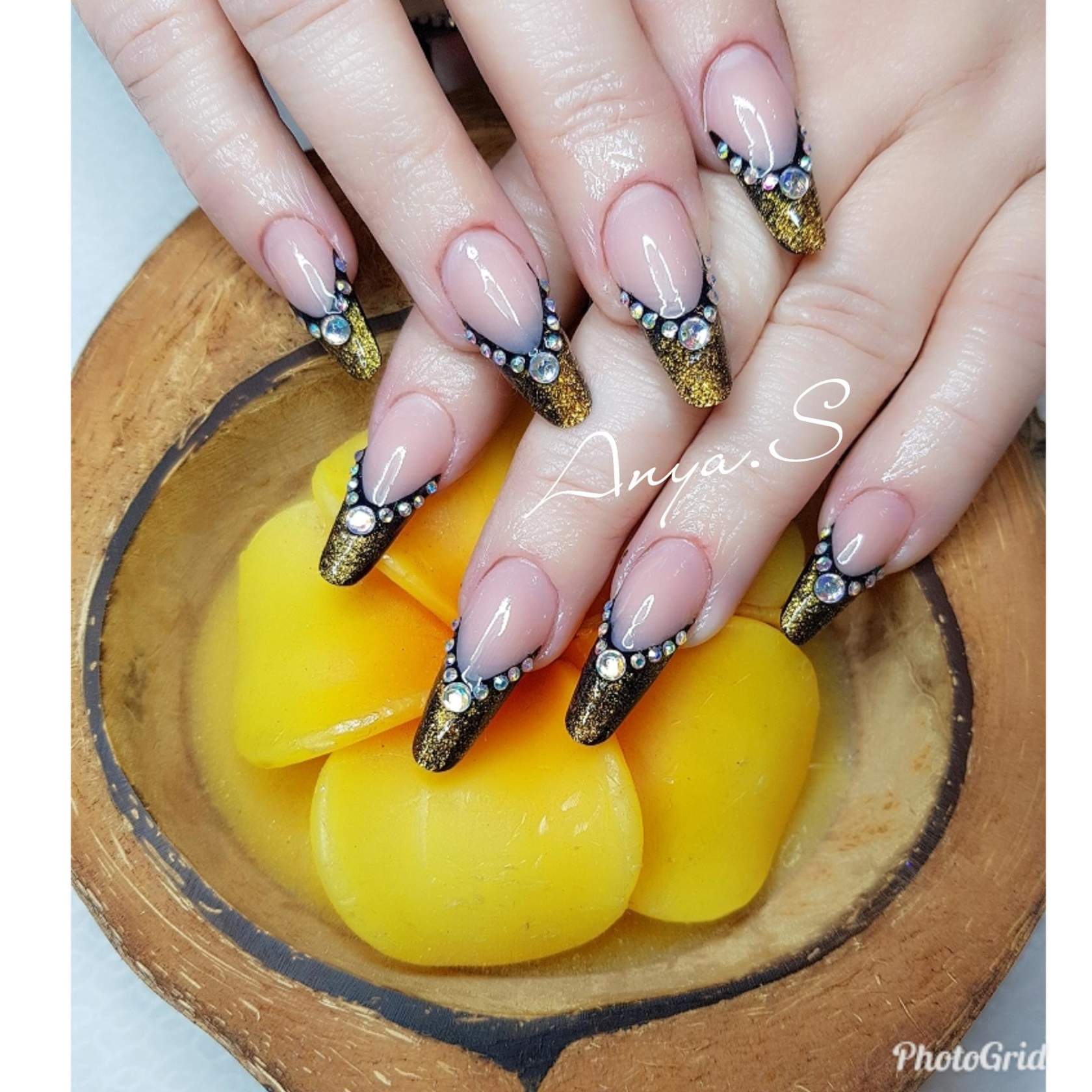 Certaines jeunes filles considèrent qu'il est nécessaire d'ajouter des notes irrésistibles et explosives à la version classique de la manucure. Les maîtres suggèrent d'utiliser des strass pour cette fantaisie. Les pierres scintillantes soigneusement disposées sur le bord du sourire apporteront une touche originale et dilueront votre quotidien. Une telle manucure est également pertinente pour un événement solennel.