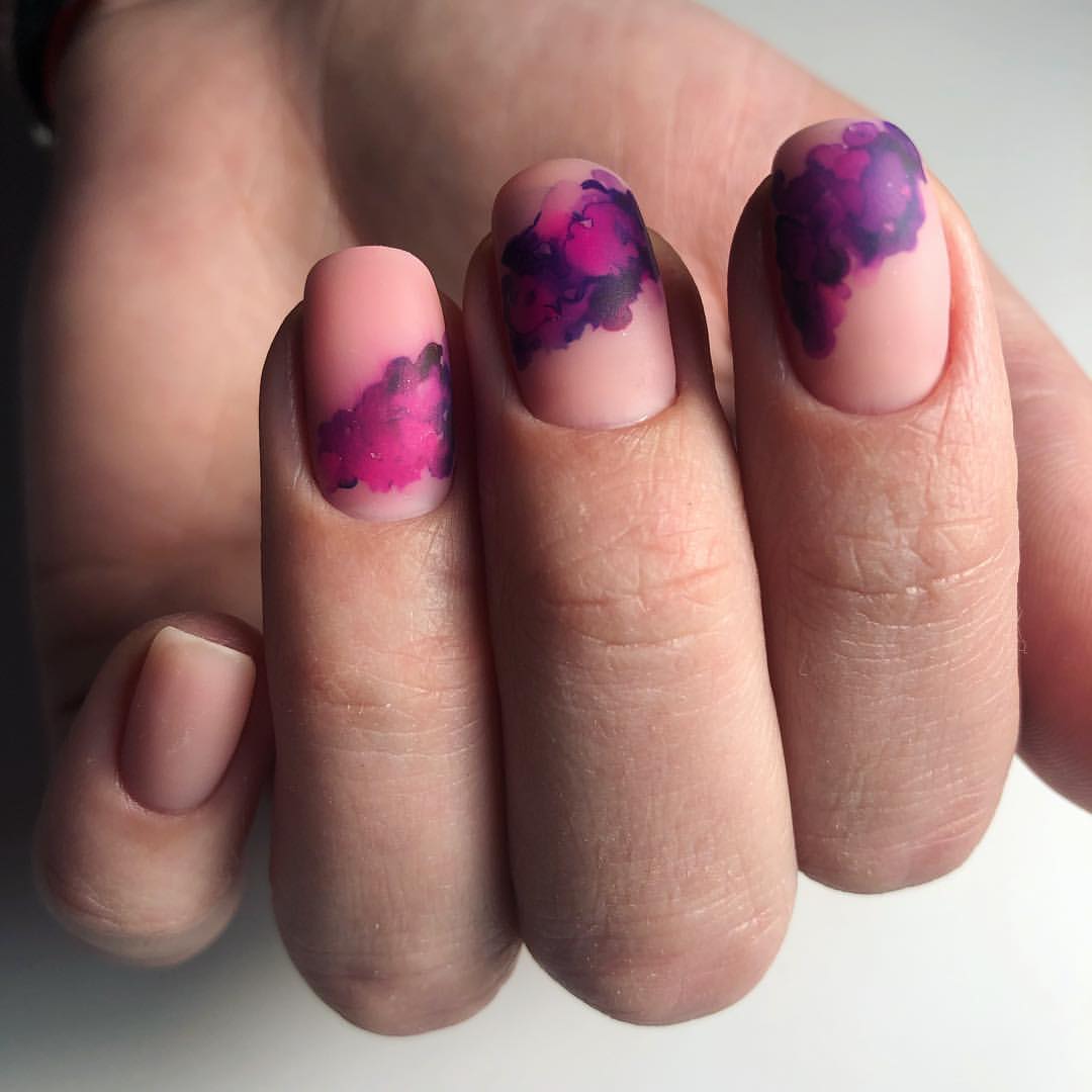 Une conception intéressante, contrairement à toute autre chose, devient de plus en plus populaire sur le mouillé. Sa caractéristique principale est des dessins lisses et mous sans limites claires. Cet effet ne peut être obtenu que si vous faites une manucure avec un gel lustrant. Sur un revêtement non séché, les nuances qui s'étalent lentement sur la surface sont mélangées. En quelques minutes, un artisan expérimenté réalisera un motif abstrait, romantique ou même floral. À la maison, faire une telle manucure est assez difficile. Cependant, ne vous précipitez pas pour être contrarié, un peu de pratique et tout ira bien.