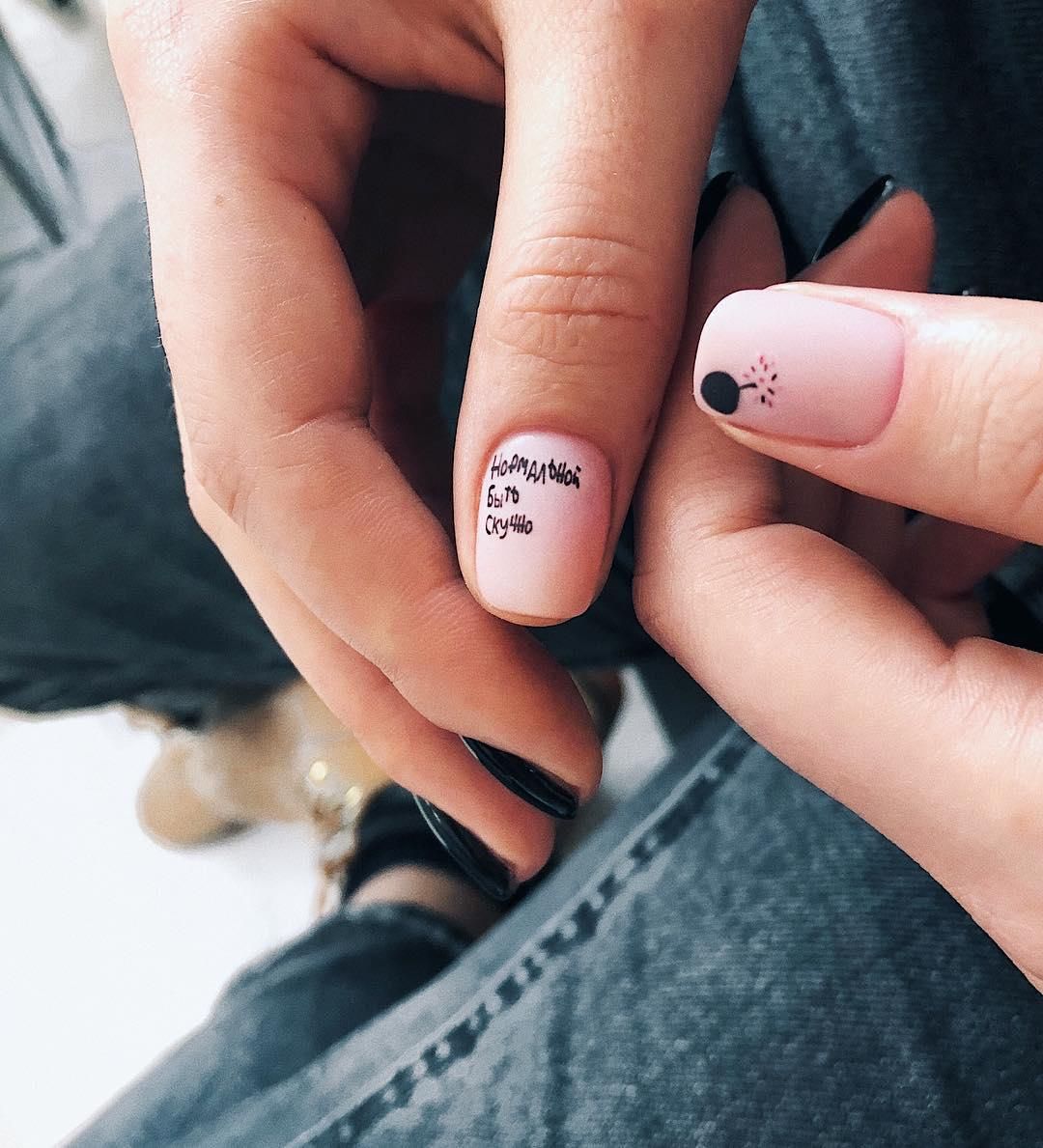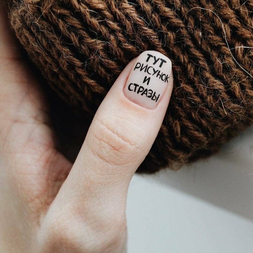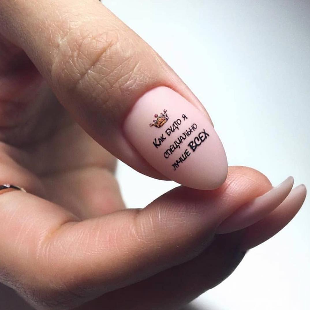 Le plus souvent sur les ongles, vous pouvez voir des phrases amusantes ou motivantes. Ils vous remontent le moral à tout moment et vous font avancer. Les phrases de fantaisie avec des modèles thématiques sont également populaires. Cependant, toutes les filles n'apprécieront pas cette option.