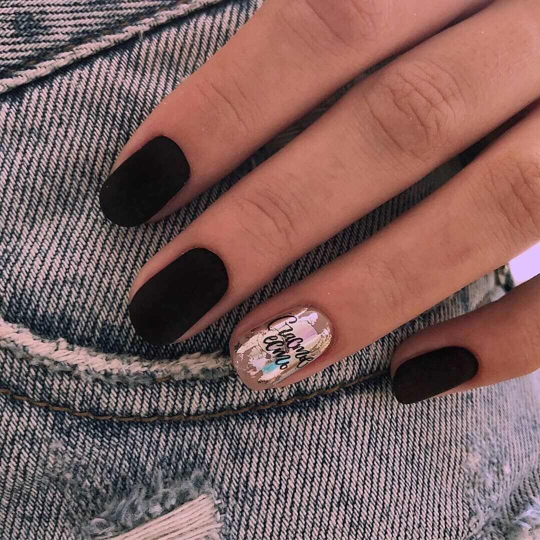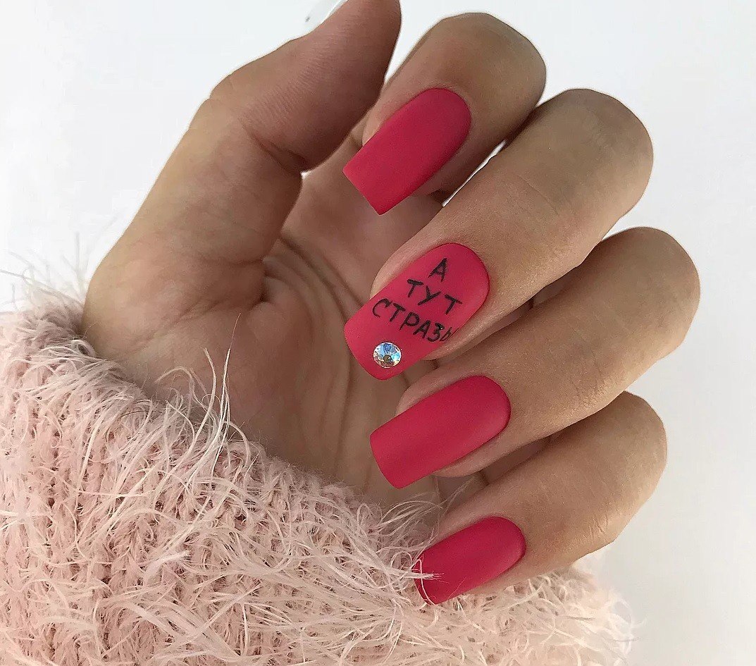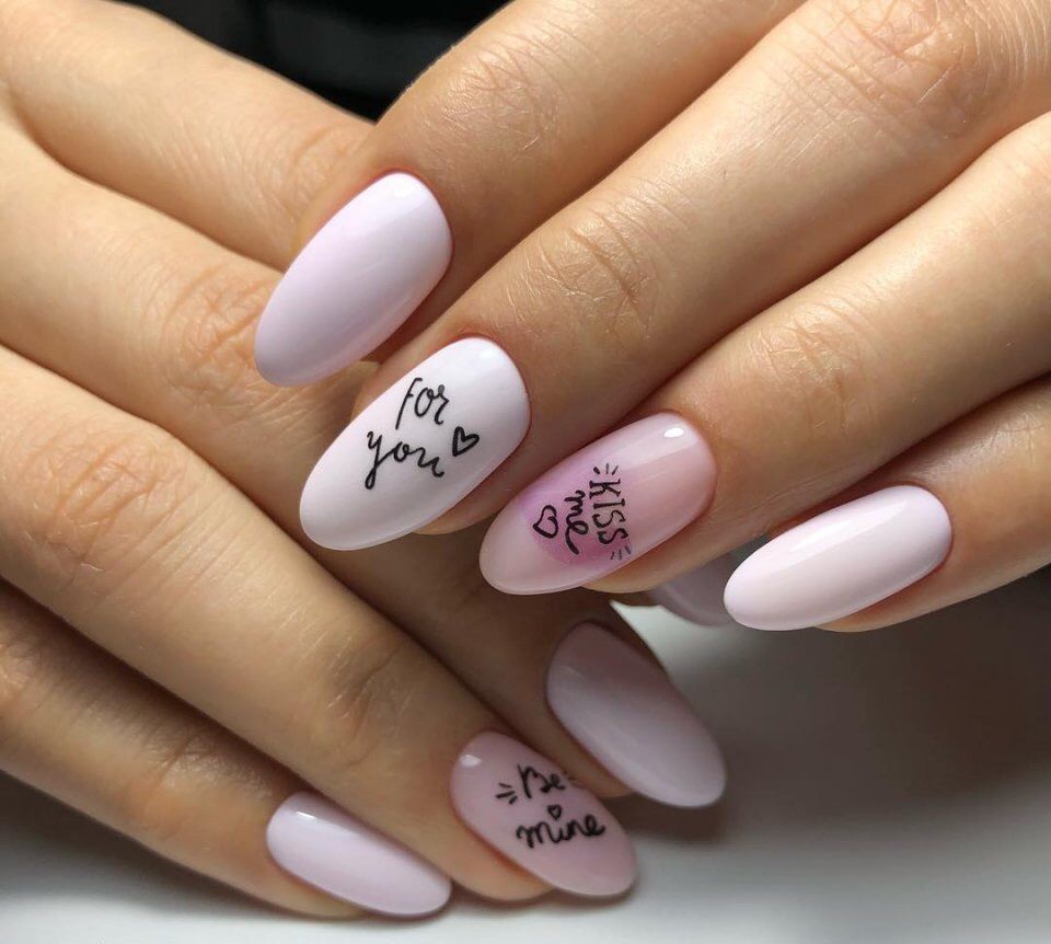 Le plus souvent sur les ongles, vous pouvez voir des phrases amusantes ou motivantes. Ils vous remontent le moral à tout moment et vous font avancer. Les phrases de fantaisie avec des modèles thématiques sont également populaires. Cependant, toutes les filles n'apprécieront pas cette option.