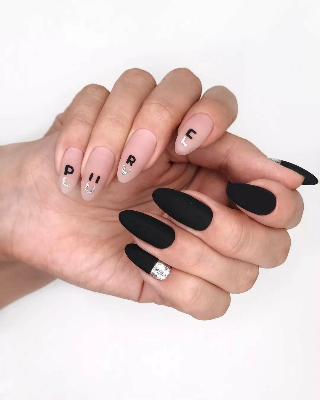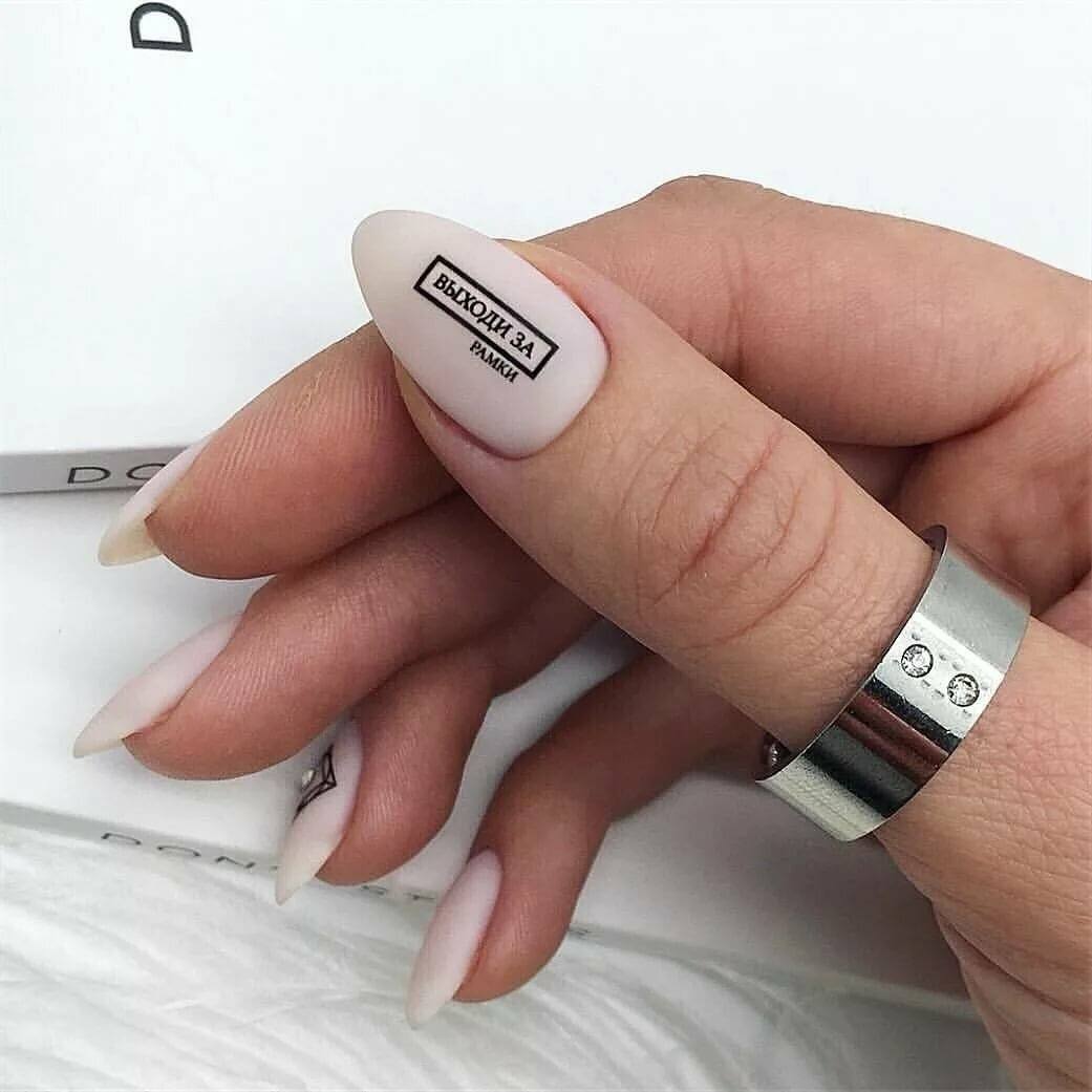 Une autre tendance de 2026 est les inscriptions. Ils peuvent être très différents, commençant par des citations et des phrases préférées et se terminant par les slogans de sociétés célèbres. Toutes les fashionistas savent sûrement que les inscriptions sont utilisées sur les vêtements, les chaussures et les accessoires. Par conséquent, il n’est pas surprenant qu’une telle tendance se soit déplacée vers la sphère du nail art.