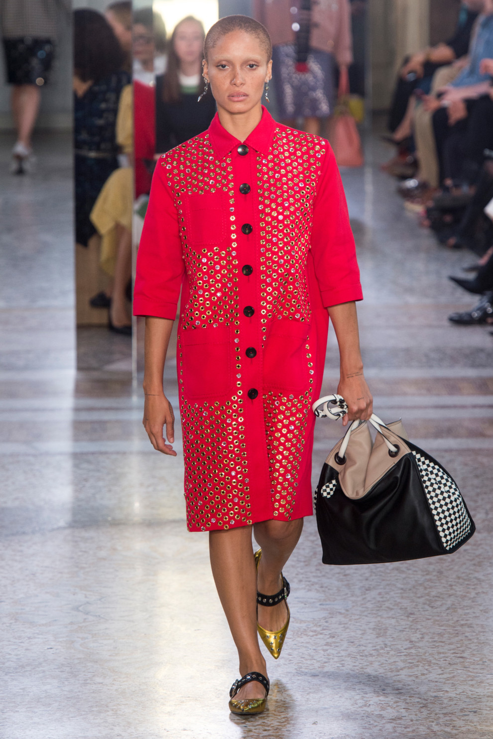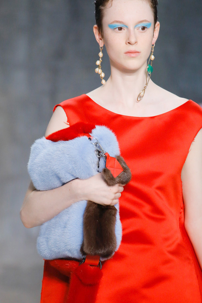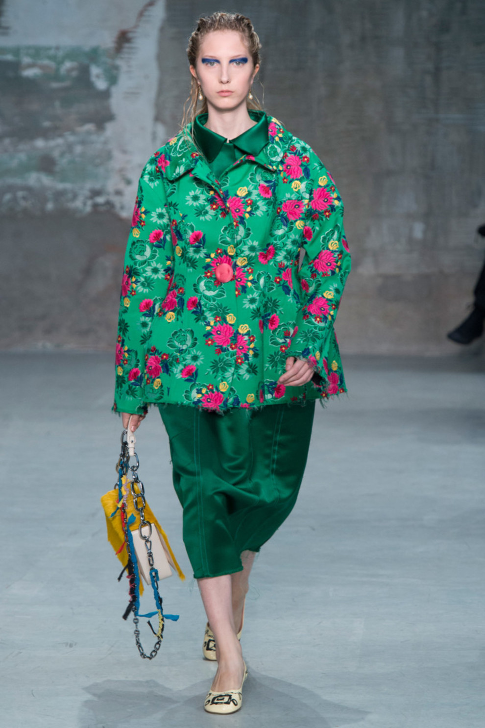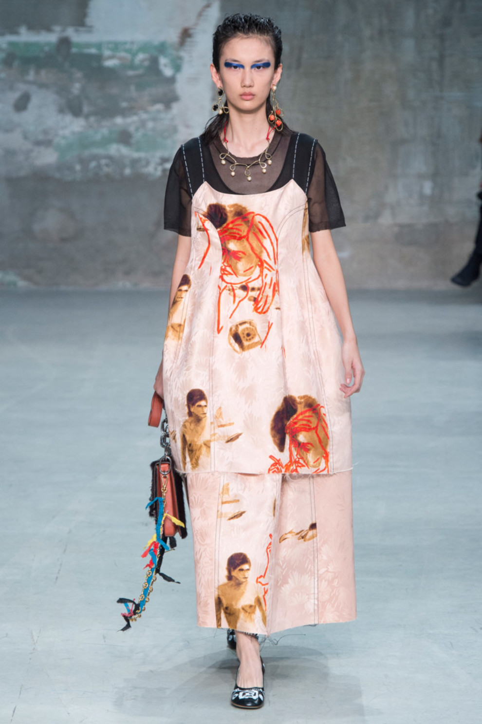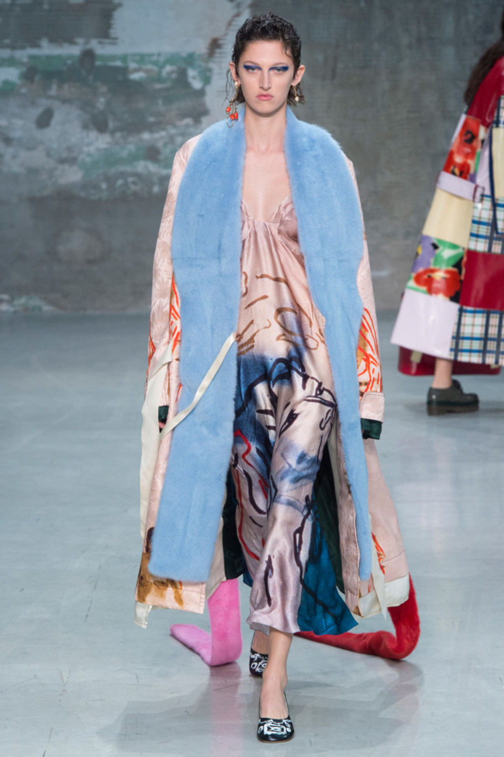 La collection colorée MARNI est représentée par des robes de cocktail à la mode, complétées par des visons roses et blancs; des produits en brocart bleu et en soie rose; grands éléments de décor spectaculaires et gravures avec des beautés nues.