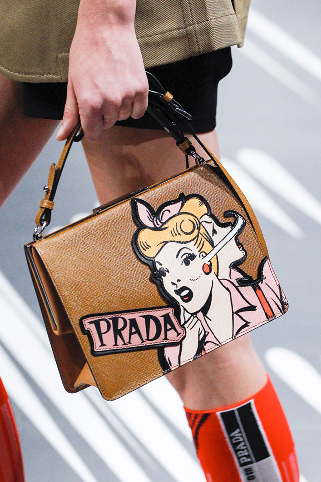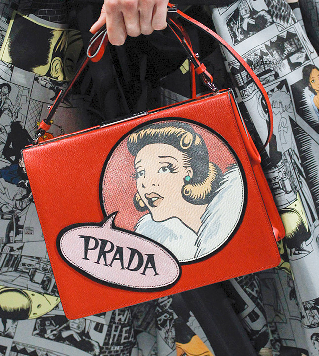 - «PRADA» avec ses modèles classiques de sacs à main en cuir de crocodile, de rétroradicules, de sacs de bowling et de messagers rivetés avec des images de bandes dessinées populaires;