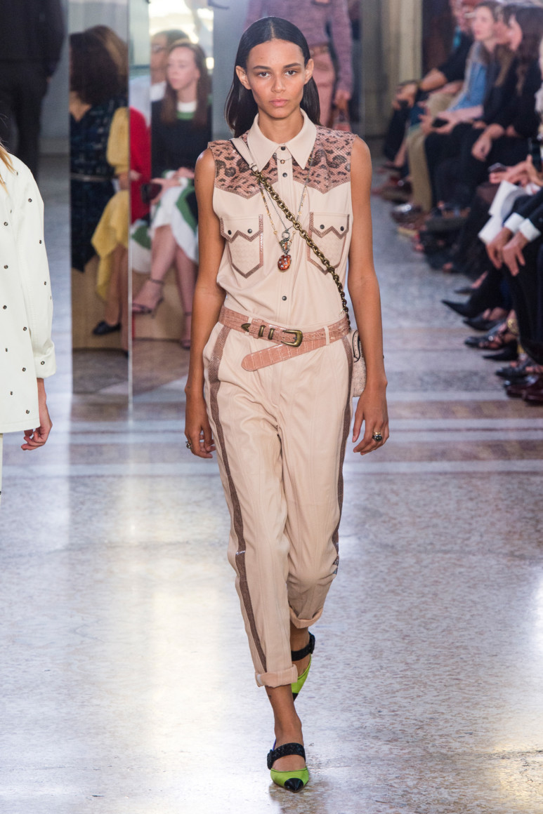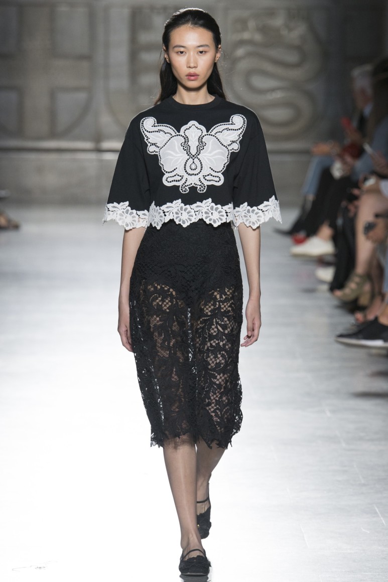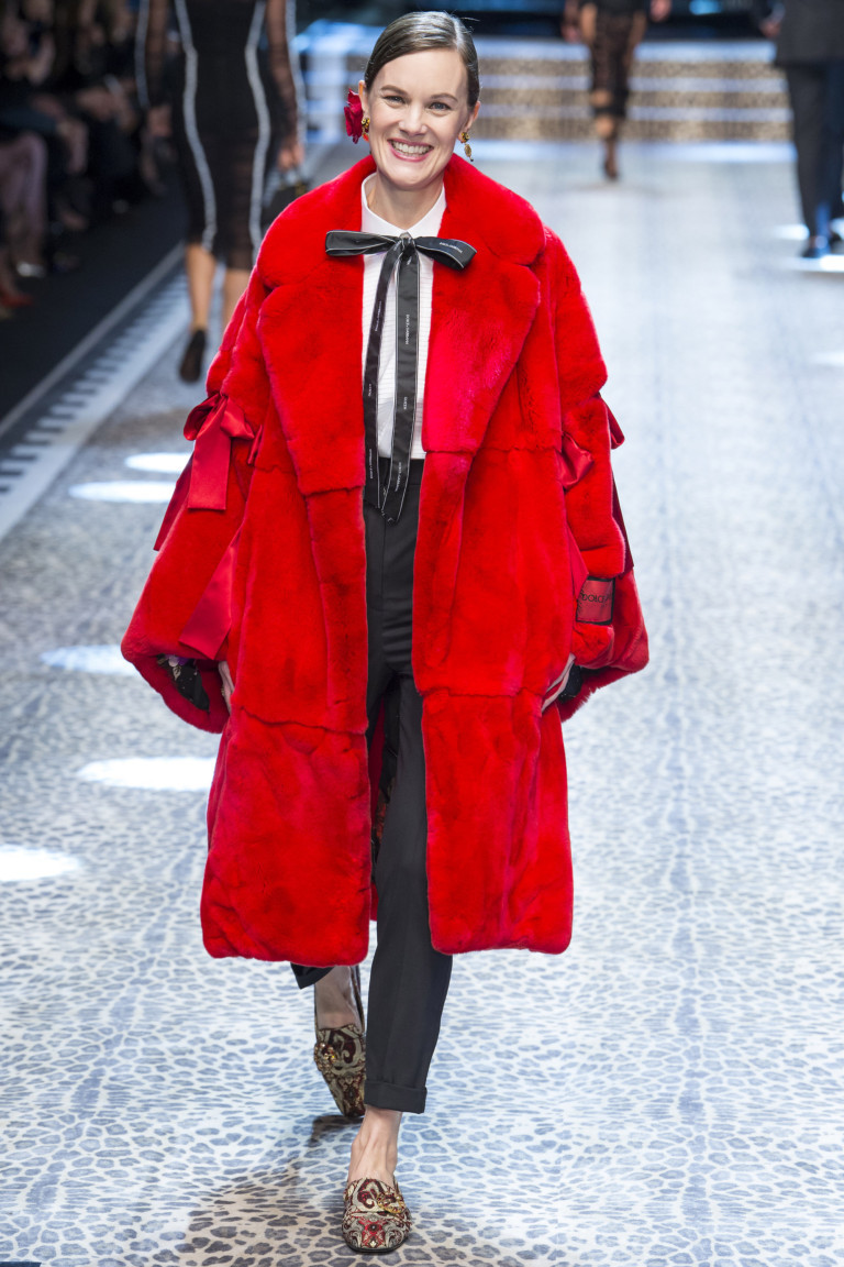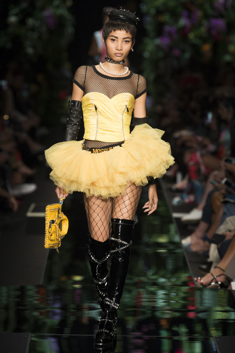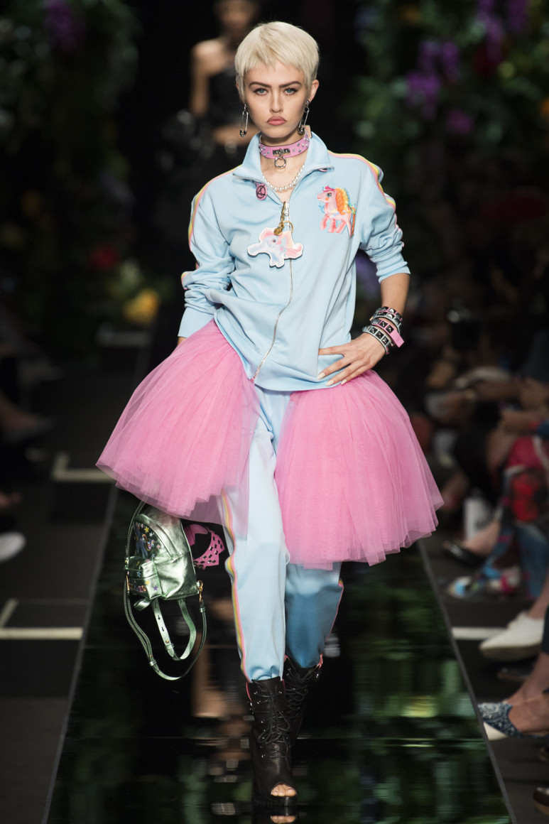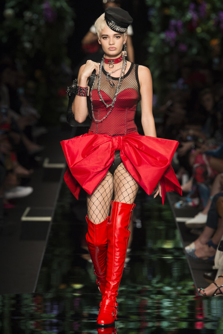 La tendance motard a été choisie par la marque MOSCHINO. Les mannequins arboraient le défilé en cuir, de la tête aux pieds. Toute la beauté des matières naturelles a été soulignée par les jupes en plumes de tutu. Mais un chic particulier de la collection a été donné par les modèles originaux de robes à fleurs dans un style romantique.