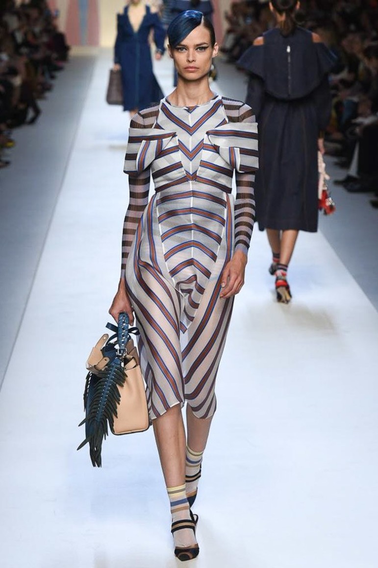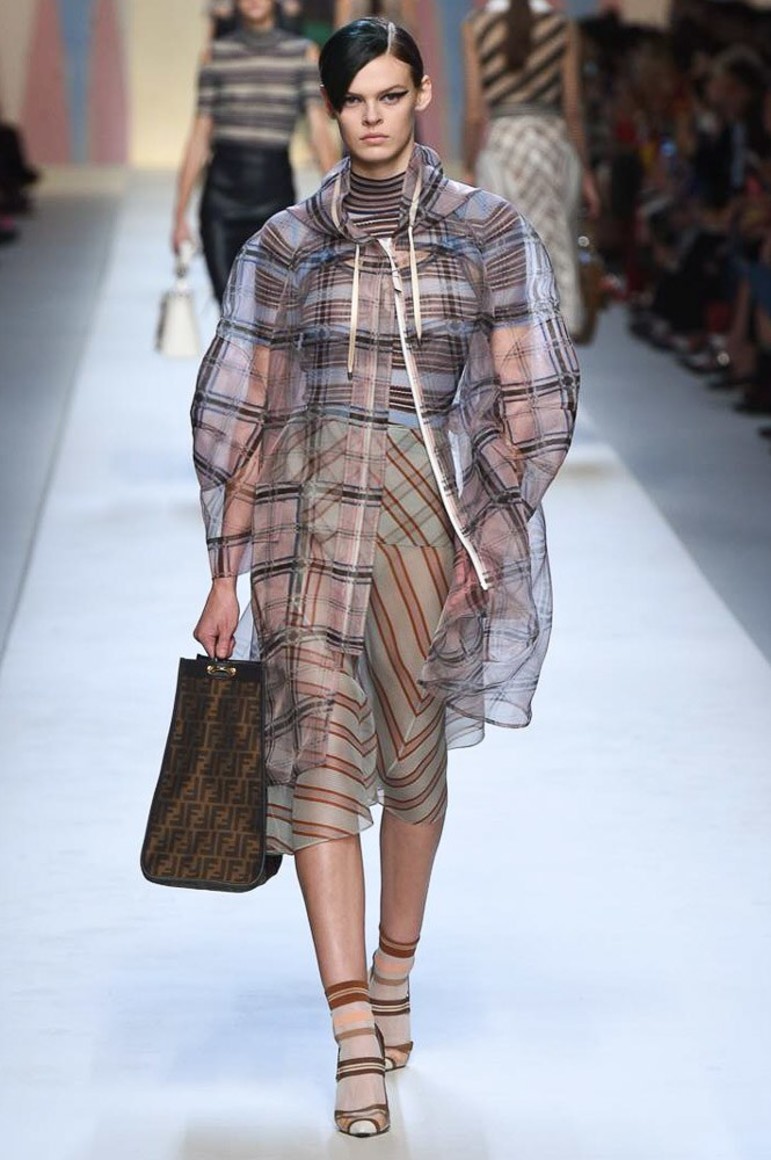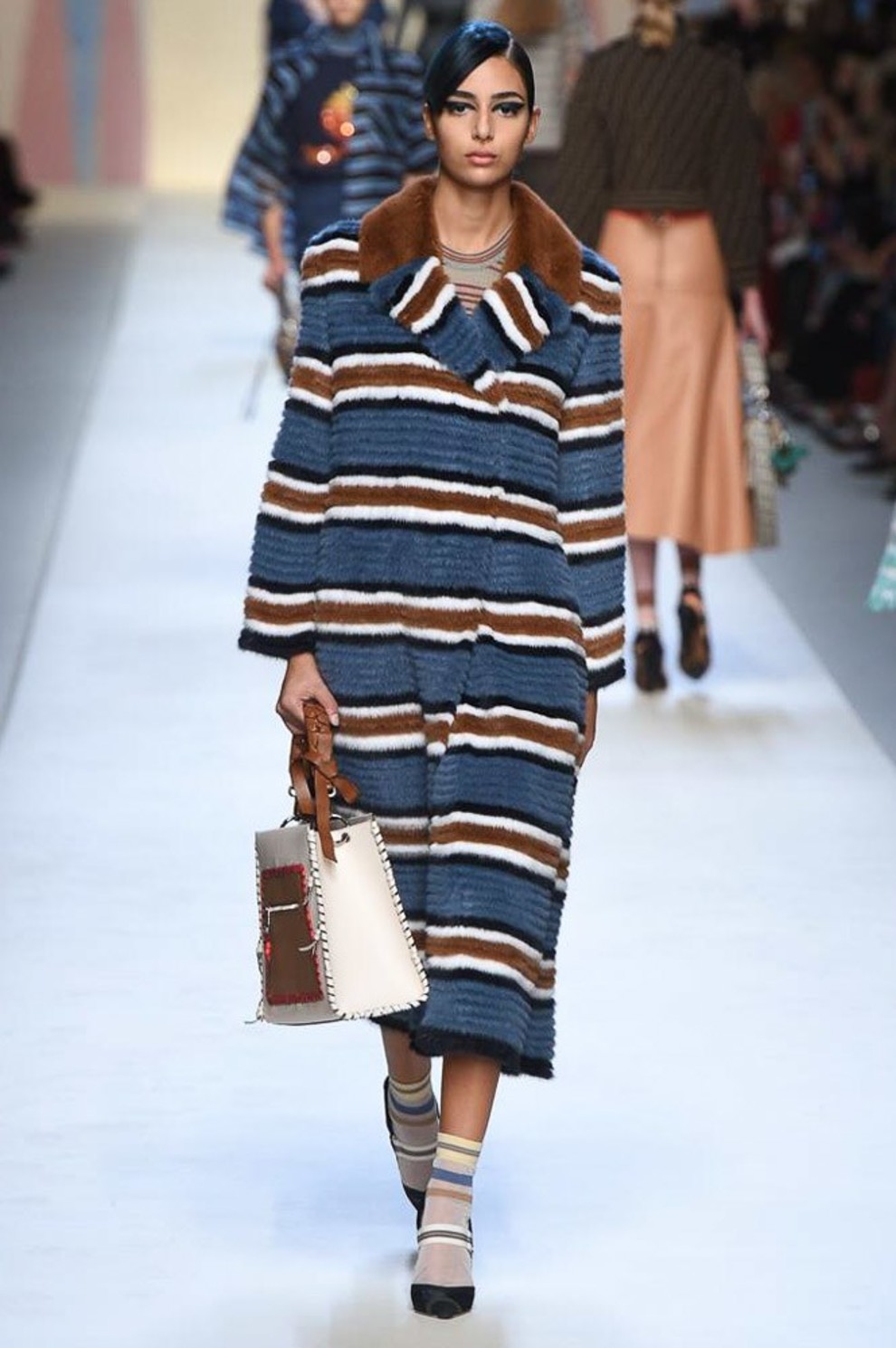 Des rayures, des rayures et encore des rayures ... C’est un chiffre énorme dans la collection FENDI, composée de matériaux transparents aux épaules ouvertes et complétée par de somptueux manteaux de fourrure.