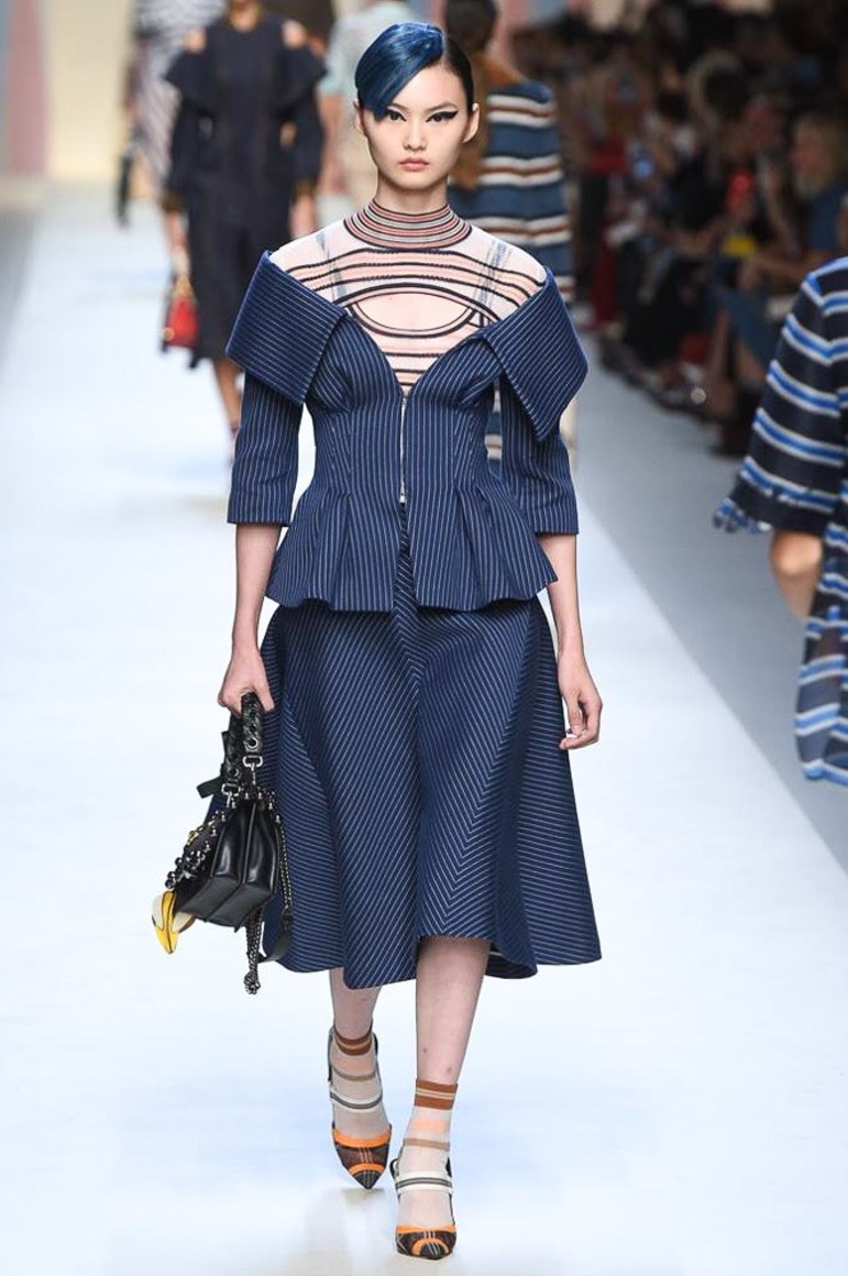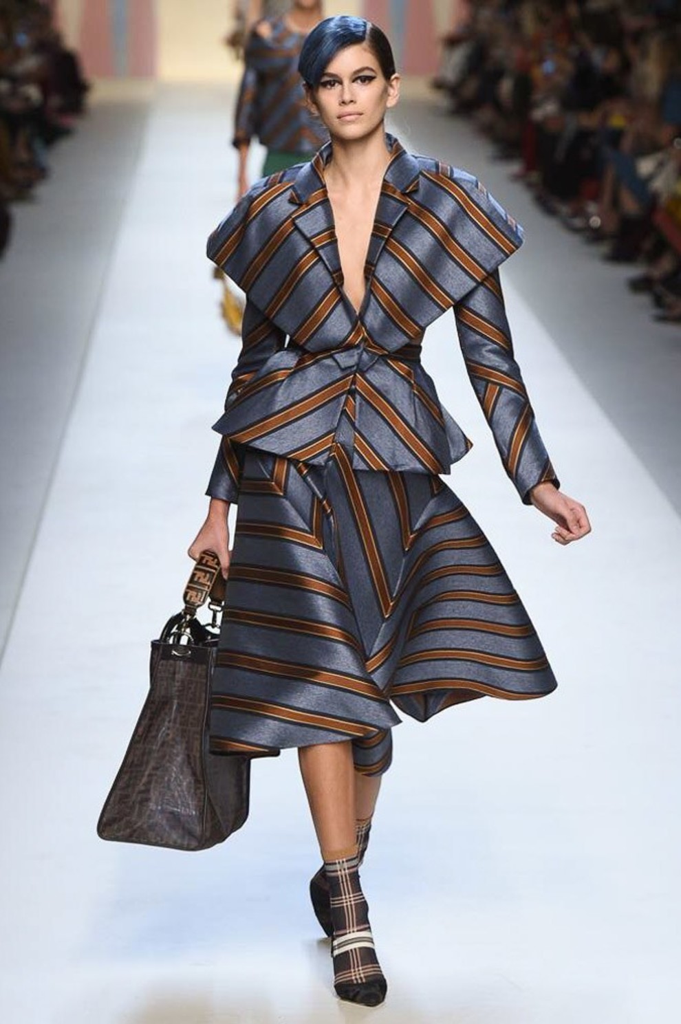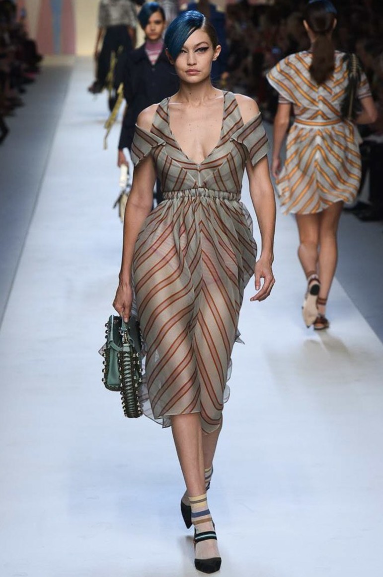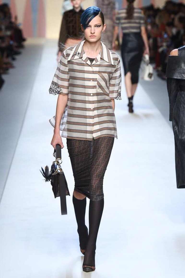 Des rayures, des rayures et encore des rayures ... C’est un chiffre énorme dans la collection FENDI, composée de matériaux transparents aux épaules ouvertes et complétée par de somptueux manteaux de fourrure.