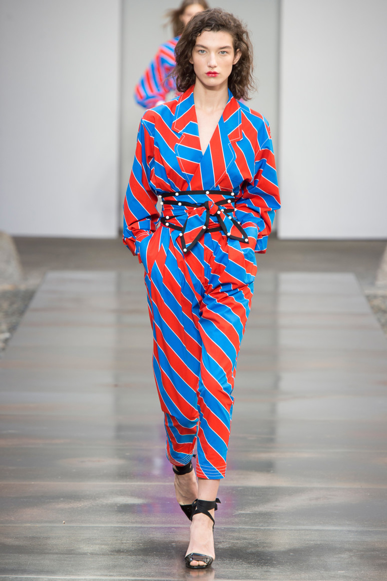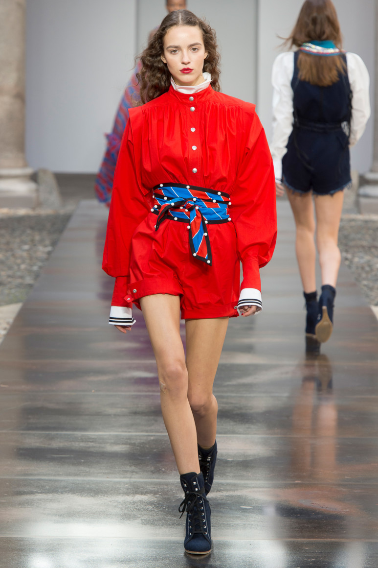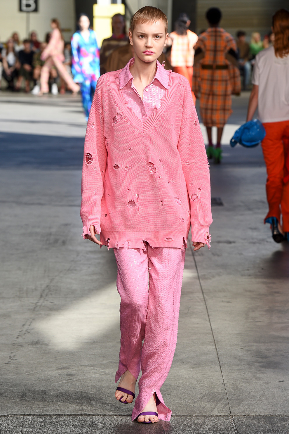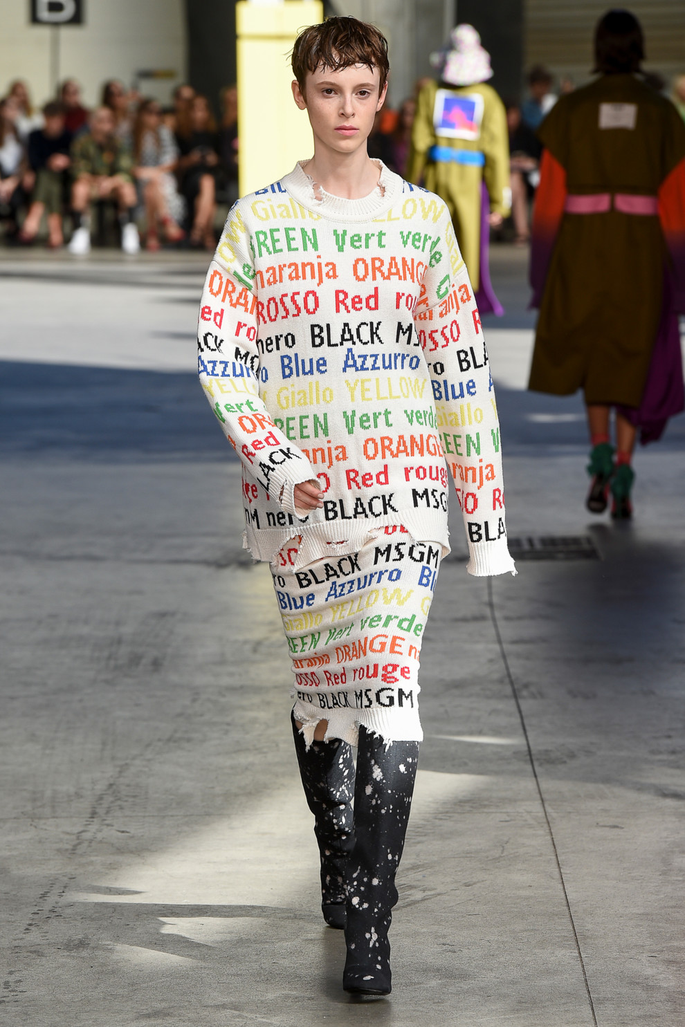 La collection de la marque MSGM a réalisé des idées de design dans les plus brillantes couleurs de l'arc-en-ciel.Les rouges, les jaunes, les verts, les bleus et les noirs se sont fondus pour former une magnifique collection à Milan. Une variété de proportions et de variantes étirées de produits est revenue sur le podium à partir des années 80.