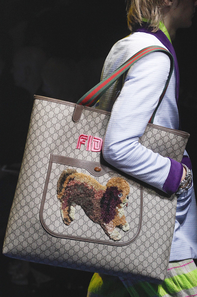 - “GUCCI” avec des modèles intéressants qui ont l’air élégant sur les ceintures et les sacs en plastique pour les magazines de mode;