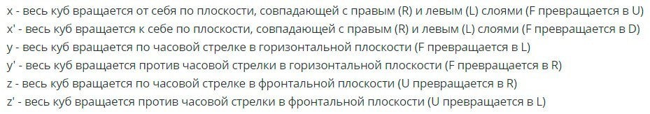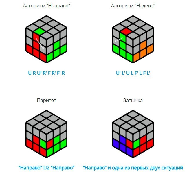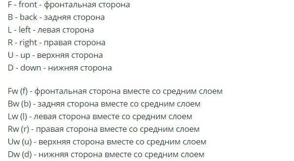 Sur Internet, vous pouvez trouver beaucoup d'algorithmes d'assemblage de puzzles. Si seule la lettre est indiquée, la position du côté doit être effectuée dans le sens des aiguilles d'une montre. Et le signe apostrophe (‘) près de la lettre indique qu’il doit être tourné dans le sens contraire des aiguilles d’une montre. Le chiffre 2 après la lettre signifie que le côté doit être pivoté deux fois. Par exemple, D2 ’indique que le côté inférieur du cube doit être pivoté deux fois dans le sens antihoraire.