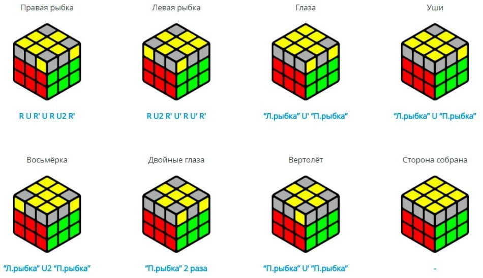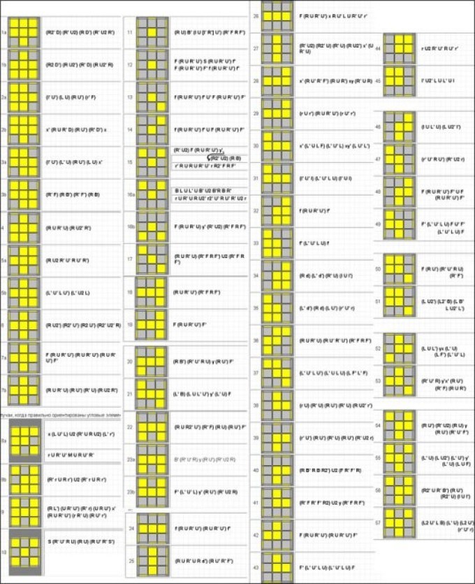 - Après cela, la couche supérieure est complètement collectée. Cette étape s'appellera OLL et consiste en de tels algorithmes.