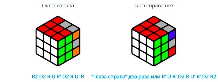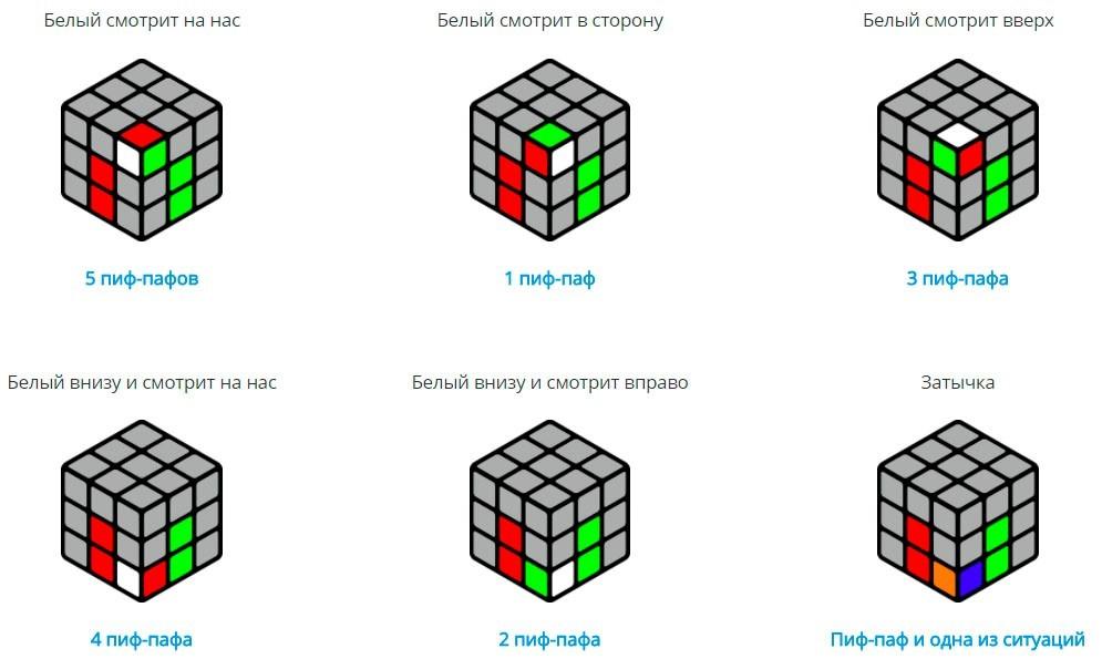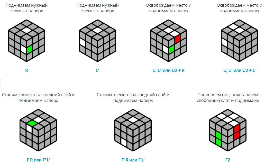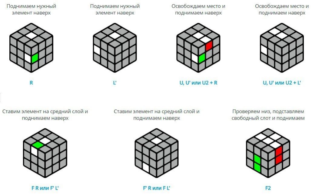 - Ensuite, deux couches du cube «F2L» sont assemblées simultanément. Ensuite, l'un de ces algorithmes est appliqué.