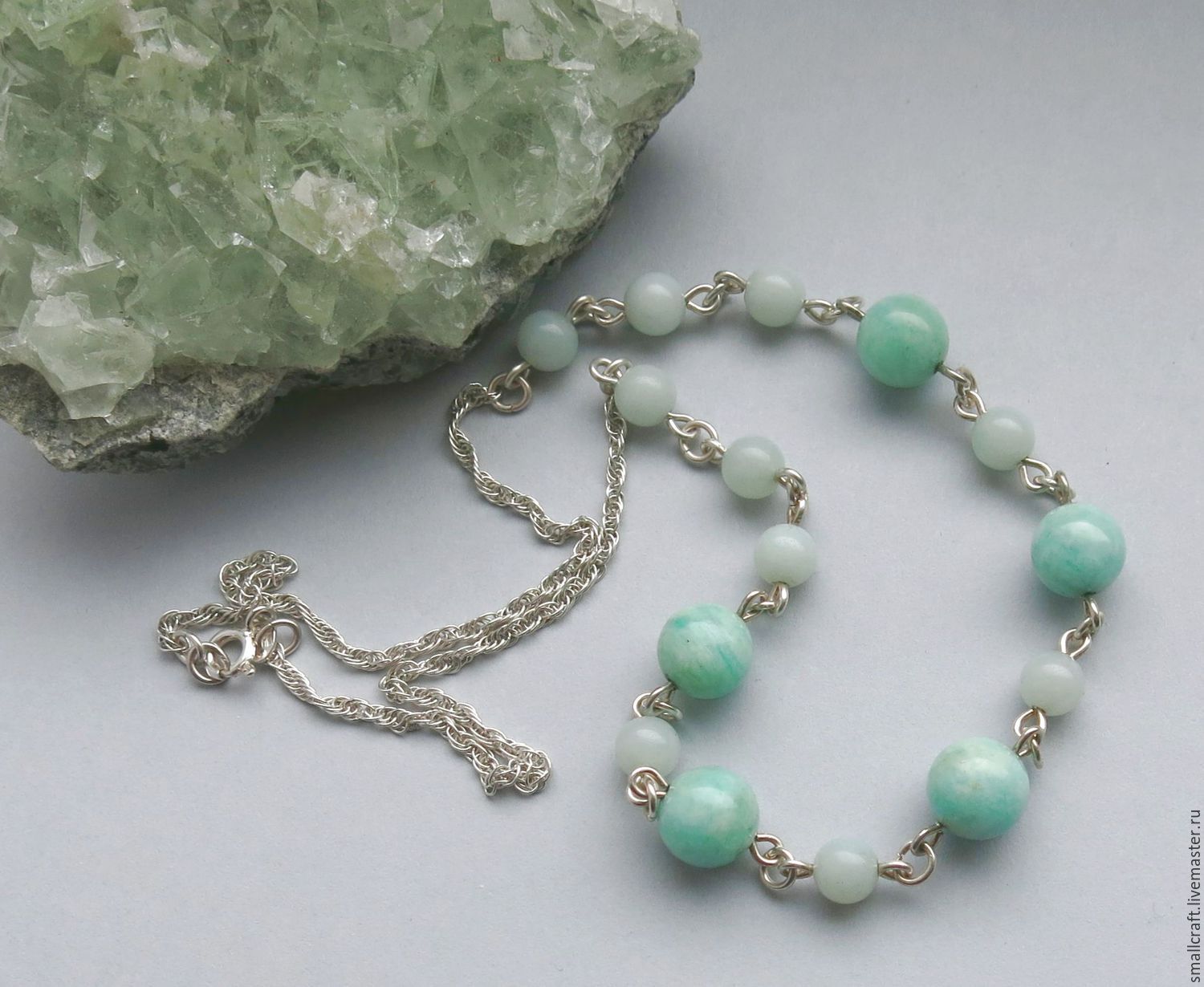 - Krupnoperitovy. Il a une teinte turquoise. Les croissances d'albite blanches présentes dans la structure de la pierre créent un motif clair à sa surface.