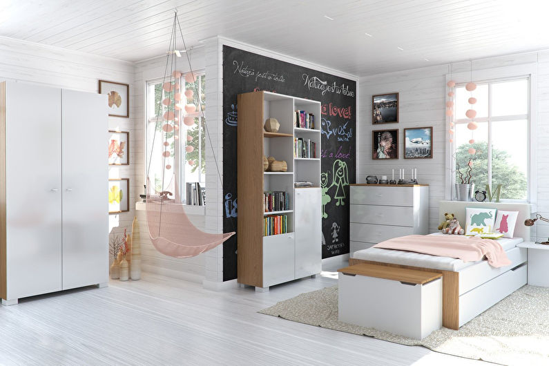 Une telle direction peut être le choix d'une fille plus âgée qui apprécie l'esthétique et la concision. Ce style s’intégrera parfaitement dans une pièce modeste et permettra d’utiliser les mètres carrés modestes le plus efficacement possible. Le mobilier est généralement utilisé de manière modulaire et fermé autant que possible.