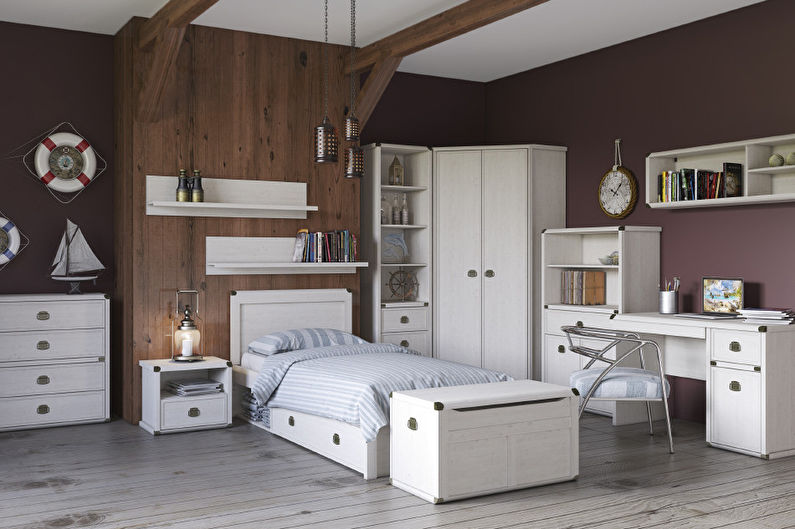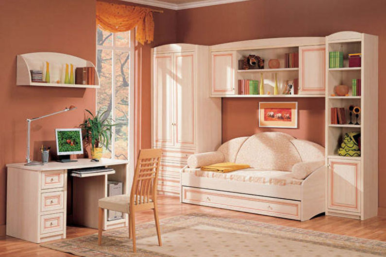 La chambre doit avoir un lit, une table et une armoire. Mais si les dimensions de la chambre d'enfant le permettent, vous pouvez toujours y placer un petit canapé, des poufs, une table de chevet pour les petites choses «secrètes», une télévision, etc.