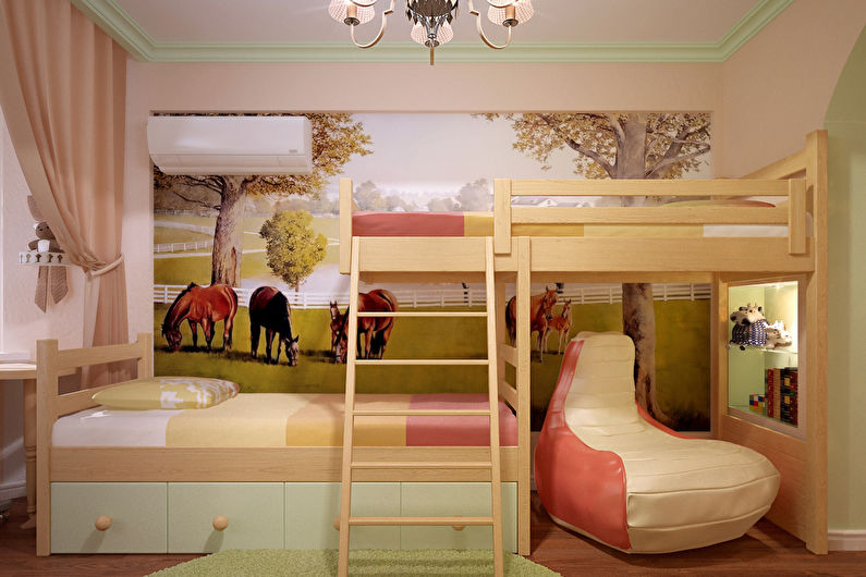 Il existe aujourd'hui sur le marché un grand nombre de meubles conçus pour plusieurs enfants à la fois. Une excellente option serait un lit superposé, où le lieu de travail est situé en dessous et où le lieu de couchage est au sommet. Ces complexes peuvent également comprendre des étagères et des tiroirs pour ranger des objets.
