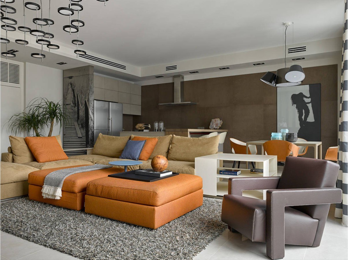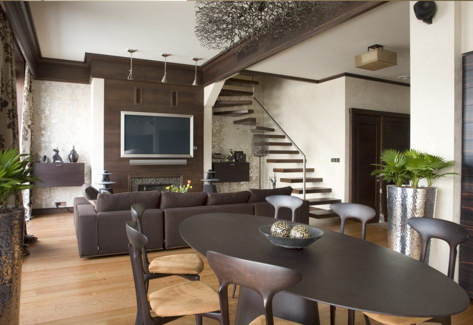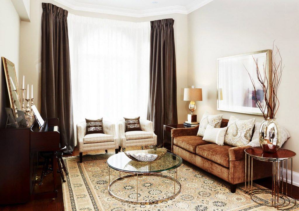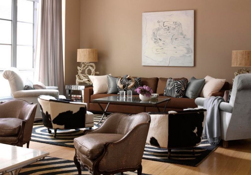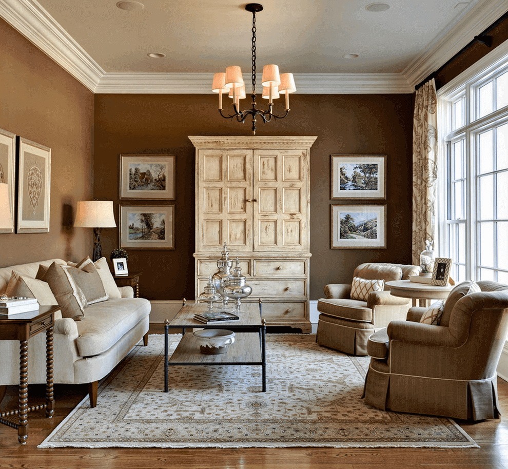 Dans la plus grande pièce de la maison, les teintes brunes peuvent être appliquées en quantité illimitée. L'essentiel est de choisir le bon ton, de déterminer sa combinaison avec divers éléments de la pièce. Sur un fond marron des murs, les meubles de la même teinte deviendront complètement invisibles.