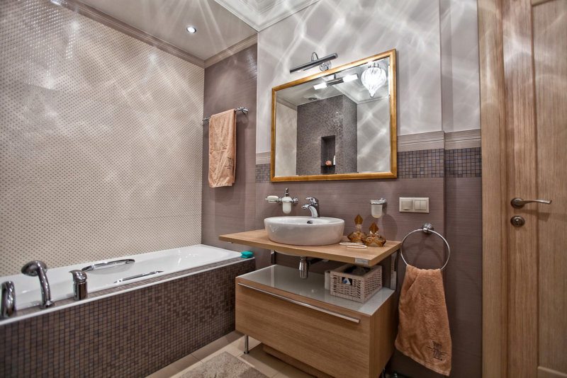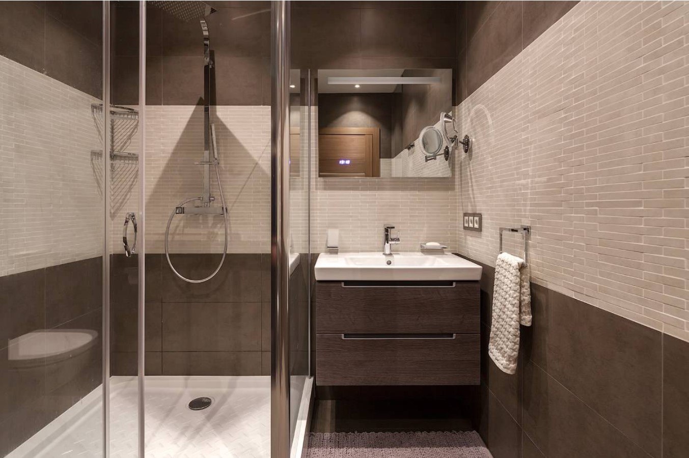Les matériaux avec un ton brun naturel - tuiles en terre cuite, pierre naturelle, brique donneront une touche écologique à l’intérieur. La combinaison de plomberie blanche et de garniture brun foncé est très élégante.