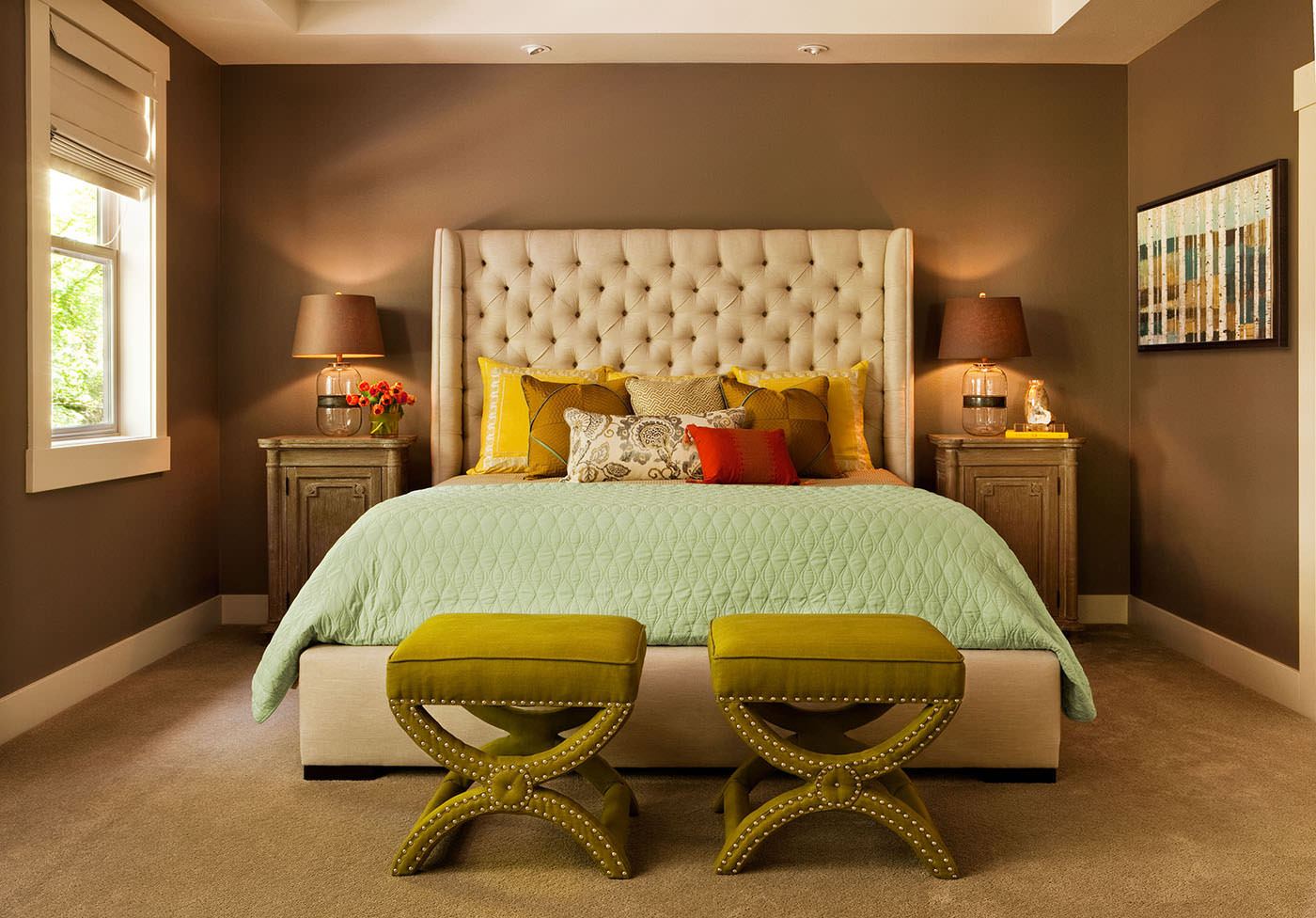 Dans la chambre à coucher, cette couleur contribuera à une détente complète et à des vacances reposantes. Une petite pièce, entièrement décorée avec des tons différents de la même couleur, est incroyablement élégante. Les draps blancs et un plafond dilueront le brun.