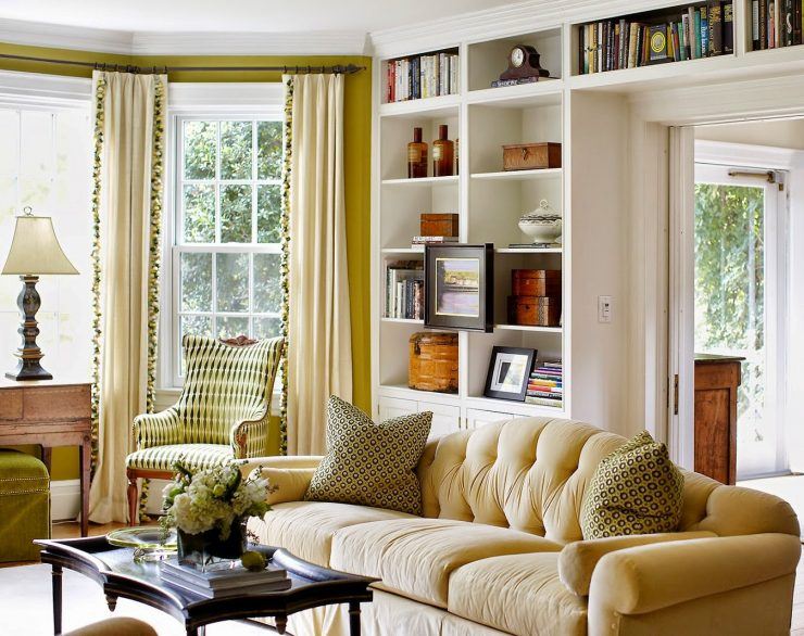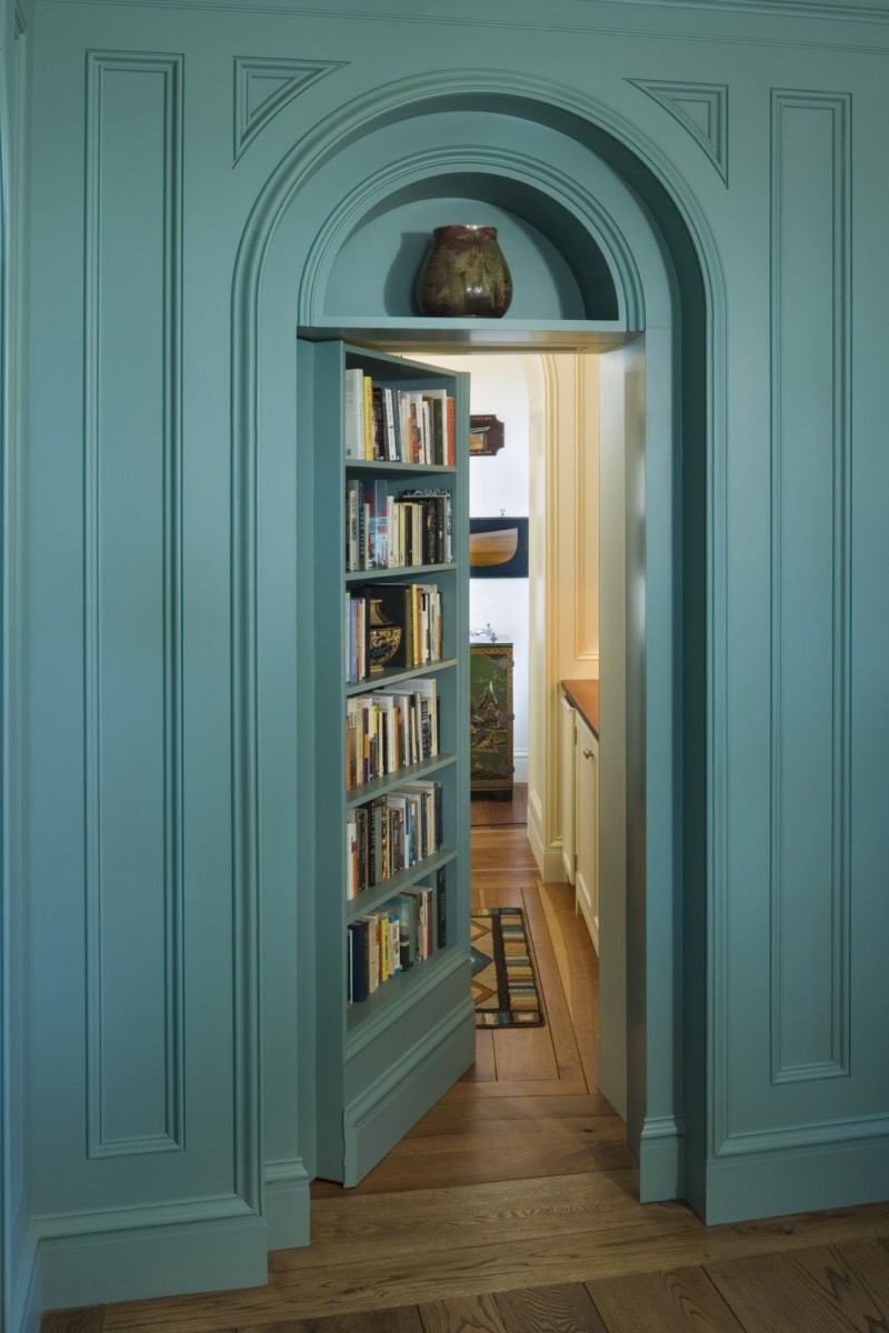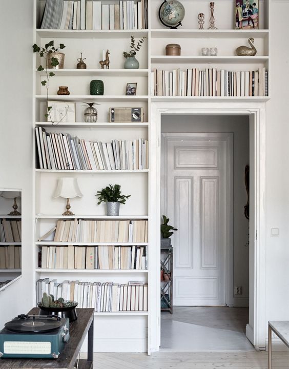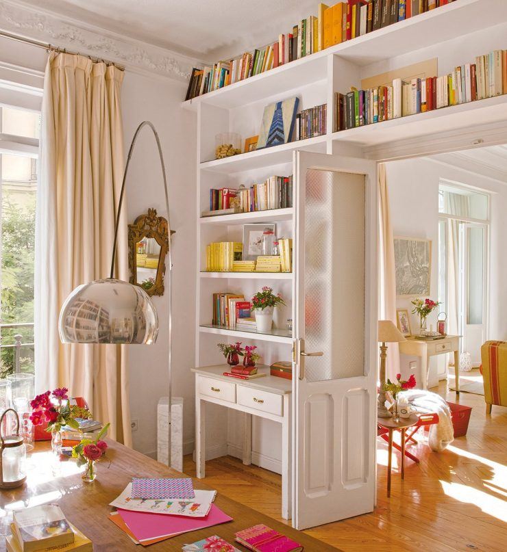 Une bonne option serait de placer les livres dans des niches. Pour les mettre en évidence, un rétro-éclairage ponctuel ou halogène est utilisé. Les étagères qui entourent la porte ou l’ouverture de la fenêtre sont créatives. Parfois, les étagères sont utilisées comme partitions pour l'espace de zonage.
