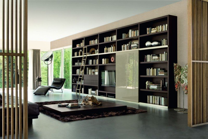 Le choix du modèle de bibliothèque dépend du design de la pièce, de la quantité d’espace libre et de sa fonction. La meilleure option serait une composition qui ne se démarque pas de l'intérieur. Par conséquent, il doit être fabriqué dans le même matériau et dans le même style et la même nuance que le reste du mobilier de la pièce.