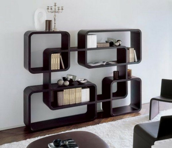 La forme de l'étagère peut être différente. À l'intérieur, vous pouvez souvent trouver des modèles invisibles. Cet effet peut être obtenu grâce au fait que tout l'espace est rempli de livres. Il semble intéressant options de zigzag, modèles sous la forme d'escaliers et une variante avec une pile d'étagères.