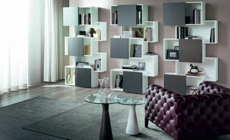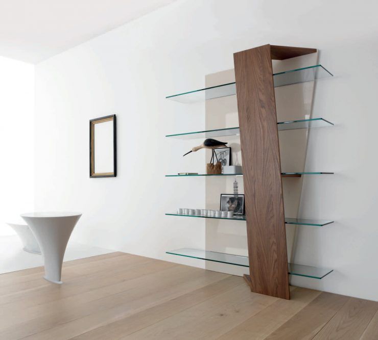 Les étagères sont murales, qui sont montées au mur ou au sol, situées au sol près du mur. Les modèles de sol diffèrent par leurs dimensions, ils sont donc généralement utilisés dans des pièces de grande surface. Ils sont également utilisés pour zoner la pièce. Leur face avant est ouverte ou fermée. Leur forme traditionnelle est rectangulaire. Cette conception comporte un ou plusieurs éléments avec différentes options pour placer des livres.