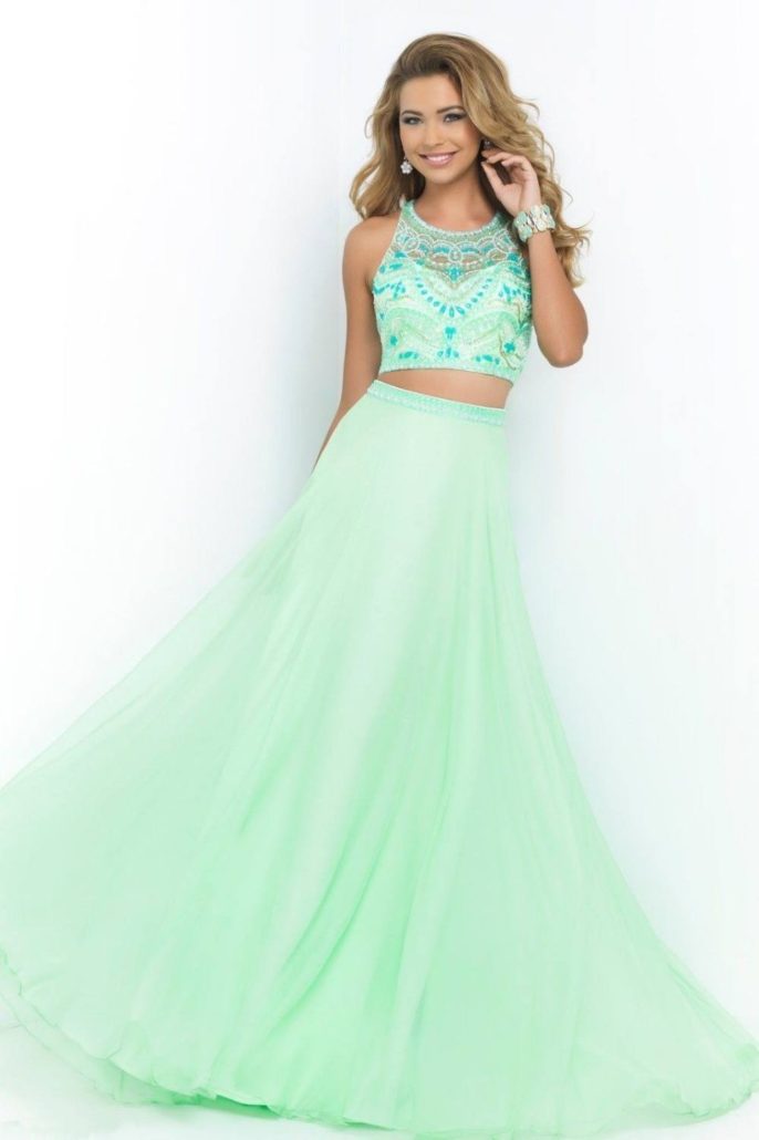 La nouveauté de la saison peut être appelée robes séparées avec une jupe et un haut court. La jupe peut être n'importe laquelle. La particularité de cette tenue est justement sa séparabilité, quand il reste un petit espace libre entre la jupe et le haut. Cependant, il convient de noter que lors de la soirée de remise des diplômes, une zone peu ouverte et un sommet modeste seront appropriés.
