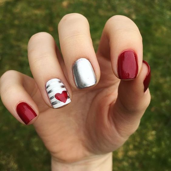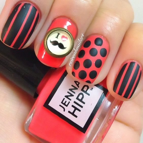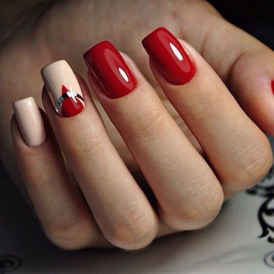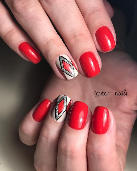 La couleur rouge est idéale pour créer une telle manucure, mais dans ce cas, vous devez lui trouver des voisins dignes. Une excellente option est une combinaison de rouge avec du jaune, du blanc, du noir ou du vert. Et vous pouvez simplement jouer avec des nuances de rouge (framboise, bordeaux, corail, etc.). Si vous le souhaitez, vous pouvez ajouter de la brillance. Mais surcharger un clou avec un tel décor n'en vaut pas la peine.