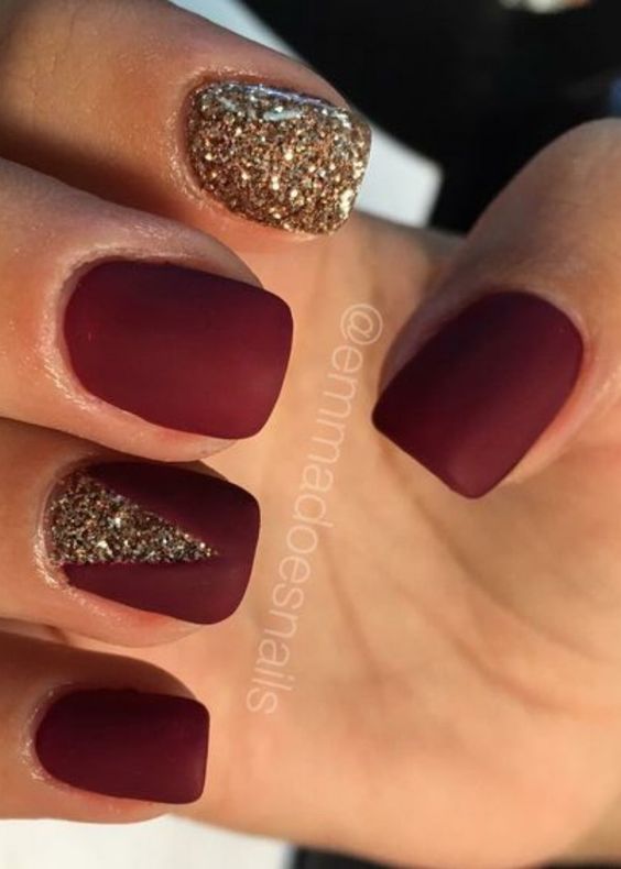 Pour la manucure, vous pouvez utiliser n'importe quel ton de rouge. Mais le meilleur de tous, l'ombre de vin va regarder sur les ongles courts. Pour donner à la manucure un aspect festif, elle peut également être décorée de strass ou décorée d’un motif.