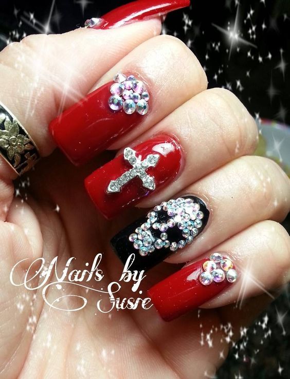 Manucure rouge avec des strass