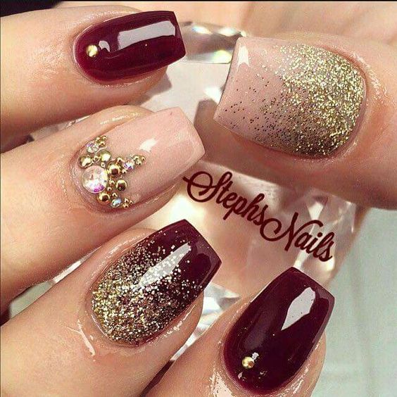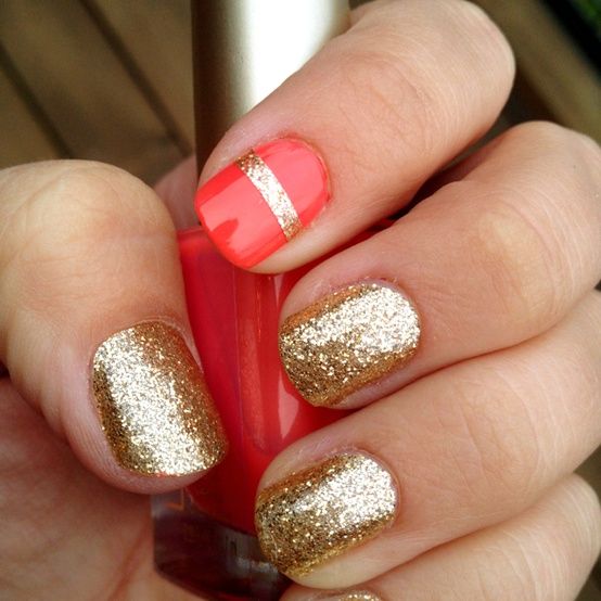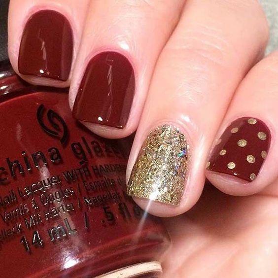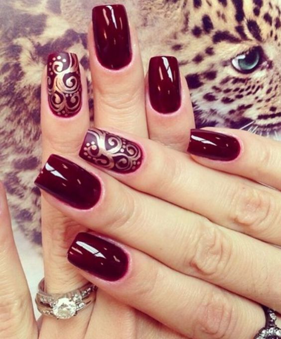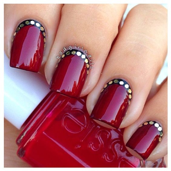Cette combinaison est choisie par les filles confiantes. Pour créer une combinaison rouge-or, vous pouvez utiliser du vernis brillant, du papier d'aluminium et d'autres décorations. Très souvent, une feuille d'or est appliquée sur un ongle peint en rouge sous forme de rayures. En outre, en utilisant un vernis doré, vous pouvez réaliser des dessins abstraits sur une base rouge.