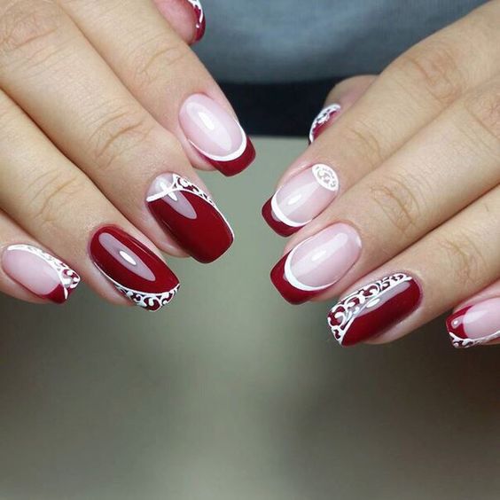Vous pouvez décorer un français rouge à l'aide de divers décors (strass, feuille, motifs floraux, etc.). La combinaison de manucure française avec la technique lunaire ou ombre est considérée comme une combinaison réussie.