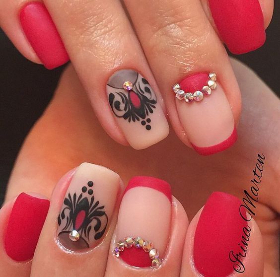 Pour rendre une telle manucure plus originale, elle peut être combinée au revêtement du trou avec des brillants, de la laque dorée ou un ornement floral. Une décision audacieuse serait de combiner le rouge avec le bleu, le jaune ou le vert.