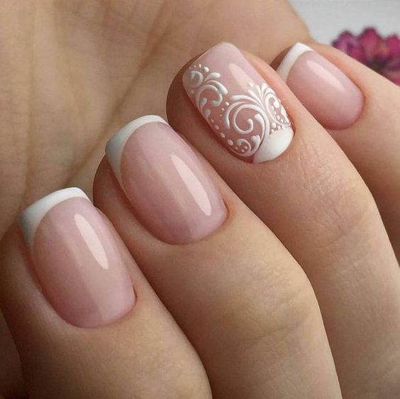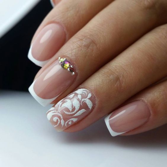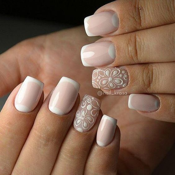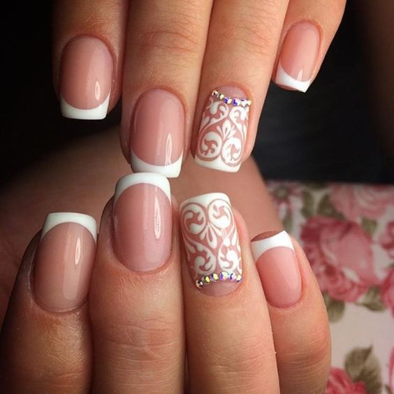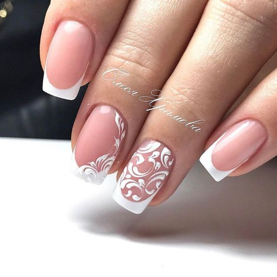 Par exemple, la manucure française est un classique qui sera toujours pertinent. Il a fière allure dans n'importe quelle palette de couleurs. En plus, ça va bien avec le design ajouré. Une telle manucure a l’air très douce, féminine et festive à la fois. Par conséquent, la dentelle française a longtemps été un favori de nombreuses épouses.