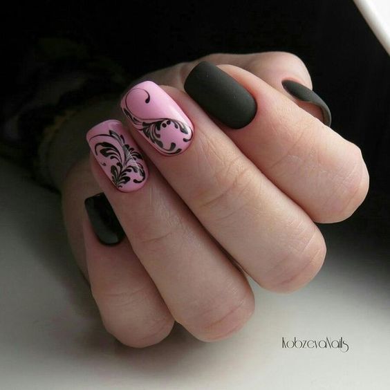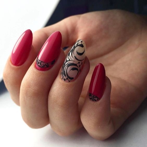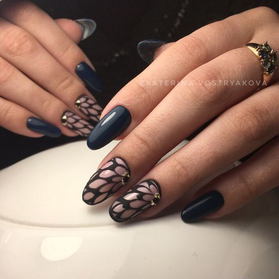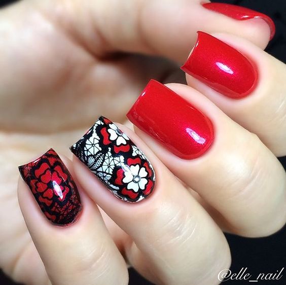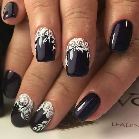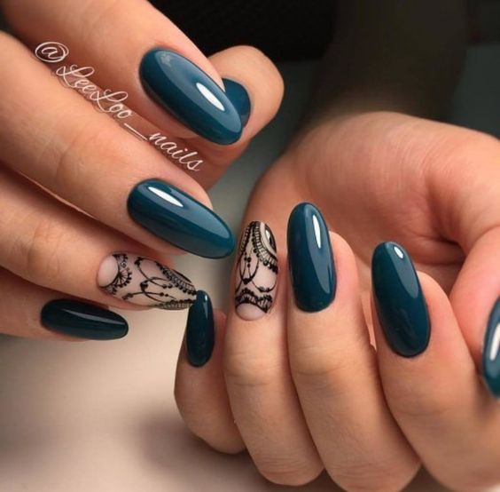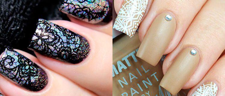Le motif de dentelle lui-même est très doux. Mais en fonction de la nuance, vous pouvez définir un caractère différent pour le motif. En outre, cela dépend beaucoup de la présence d’un tel motif sur chaque ongle ou seulement d’un accent. Assez souvent, la dentelle est complétée par un enduit monophonique ou un style spécifique.