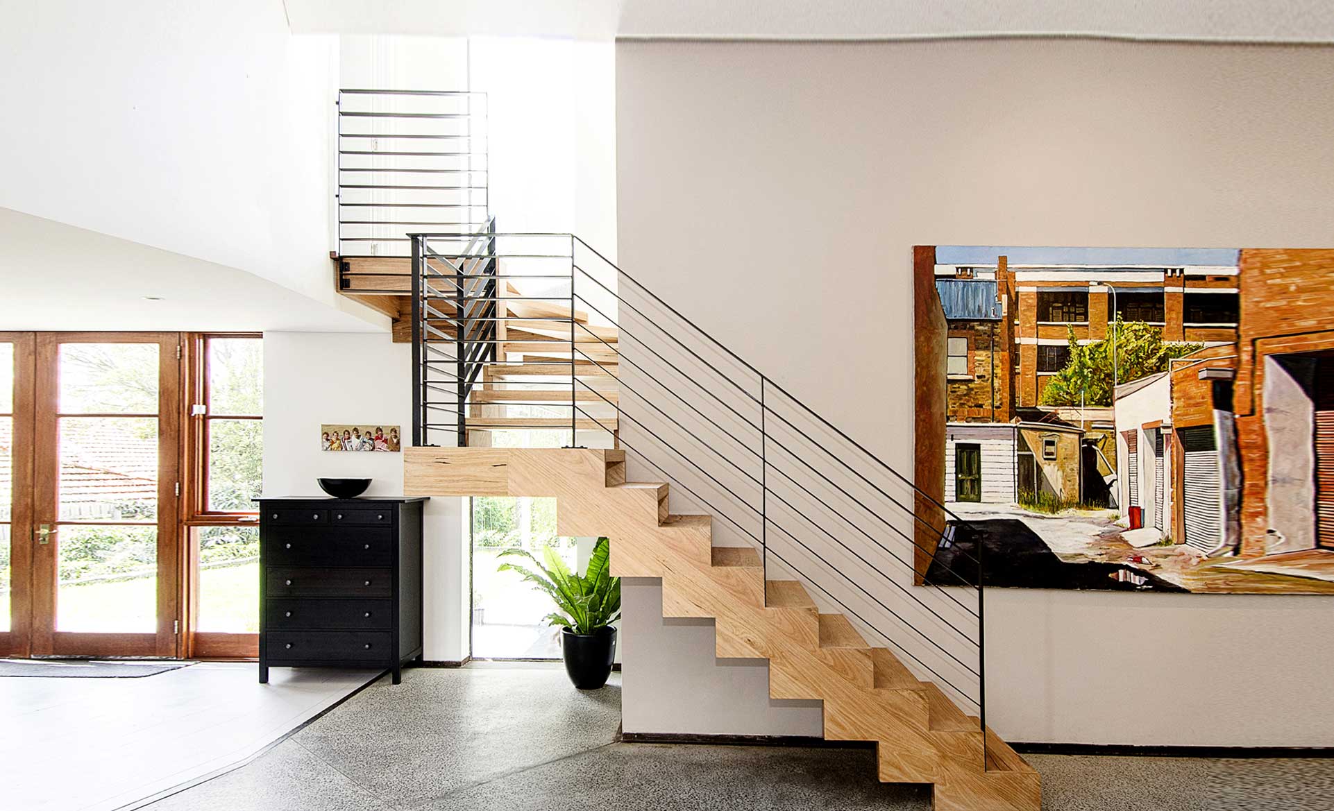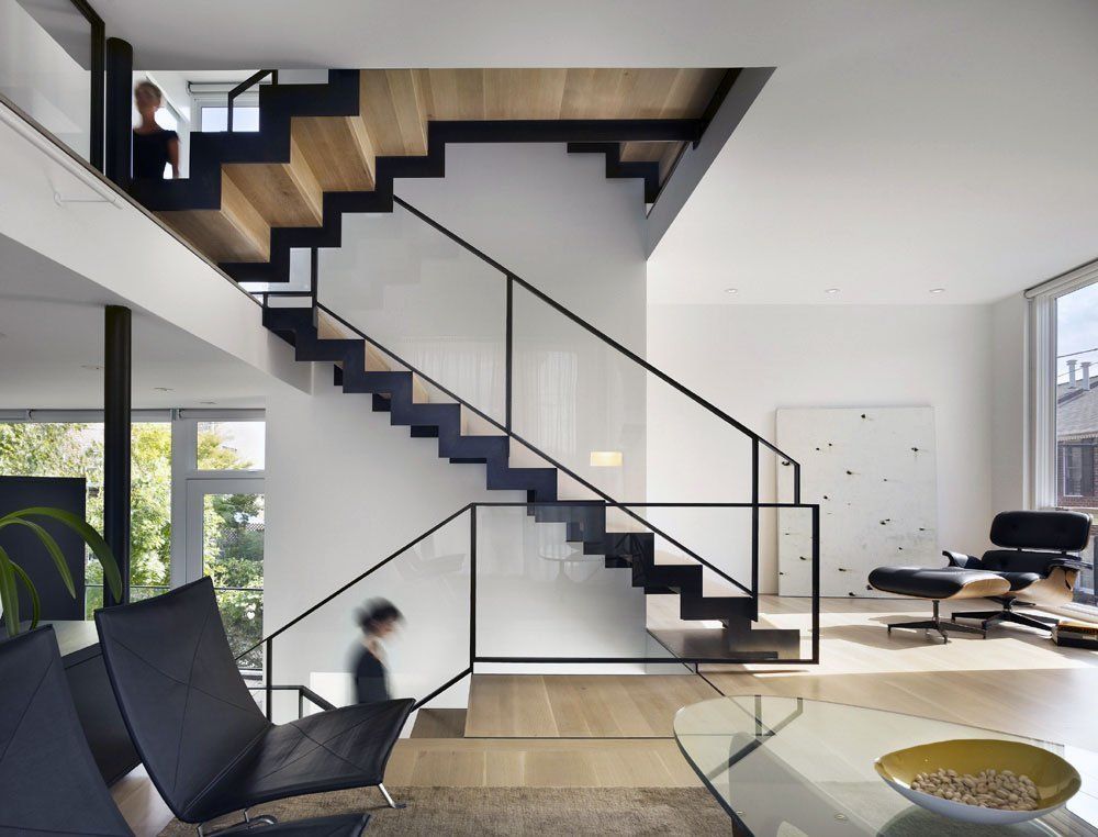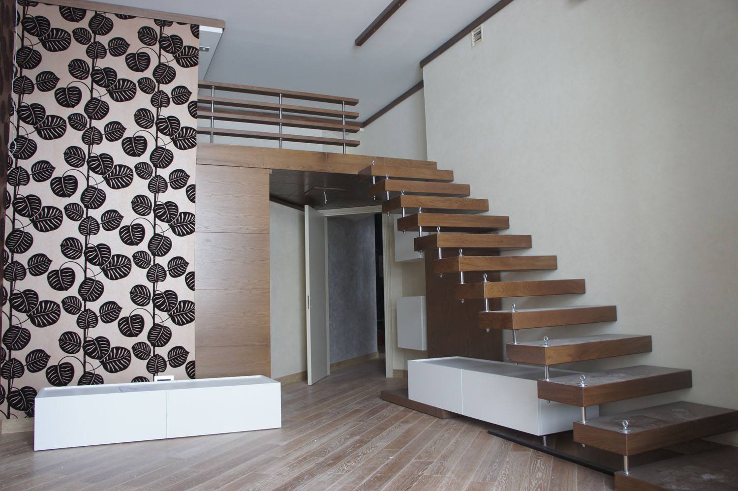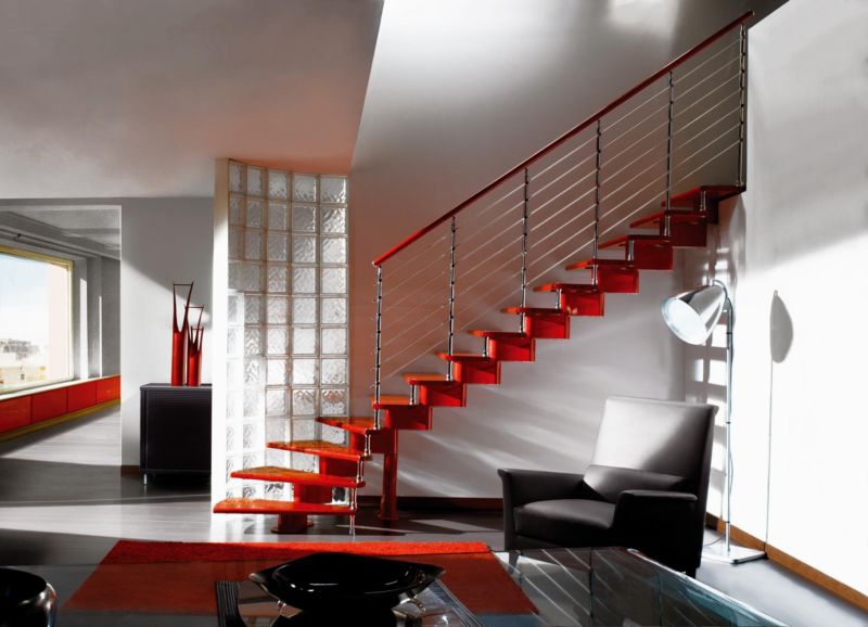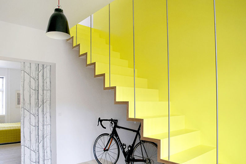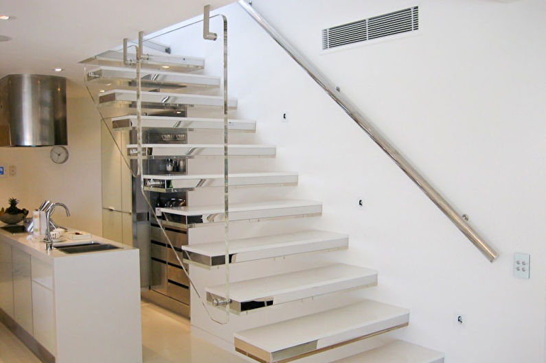 - Échelle dans les escaliers. Il n'est pas possible d'installer un tel escalier au centre de la pièce. Ses marches doivent être fixées au mur porteur à l’aide de boulons. L'aspect en apesanteur et léger de la structure donne un système unique de marches et un élément porteur.