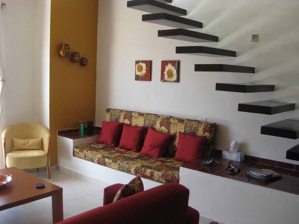 Le salon est à la deuxième place en termes de popularité de l'installation de cette structure nécessaire pour le levage au deuxième étage. Pour les bâtiments de taille moyenne, l'emplacement idéal. Pour le zonage, un escalier peut être utilisé si la cuisine est combinée avec le salon.