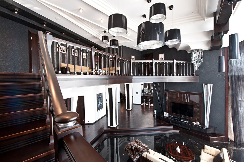 Lors du choix de la conception des escaliers menant au deuxième étage, il est nécessaire de prendre en compte le style de la pièce entière.