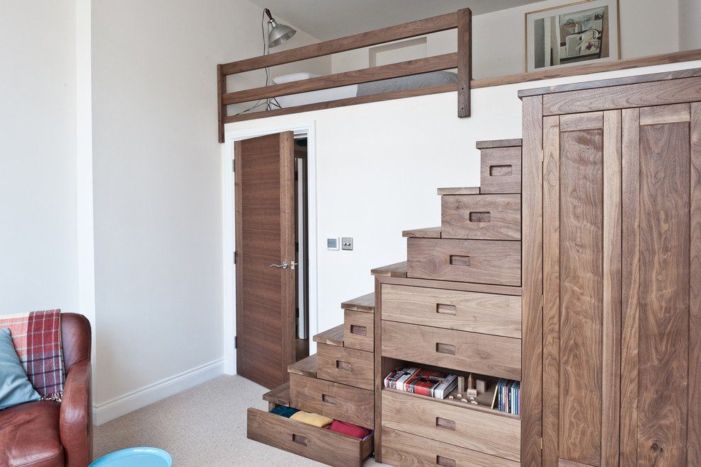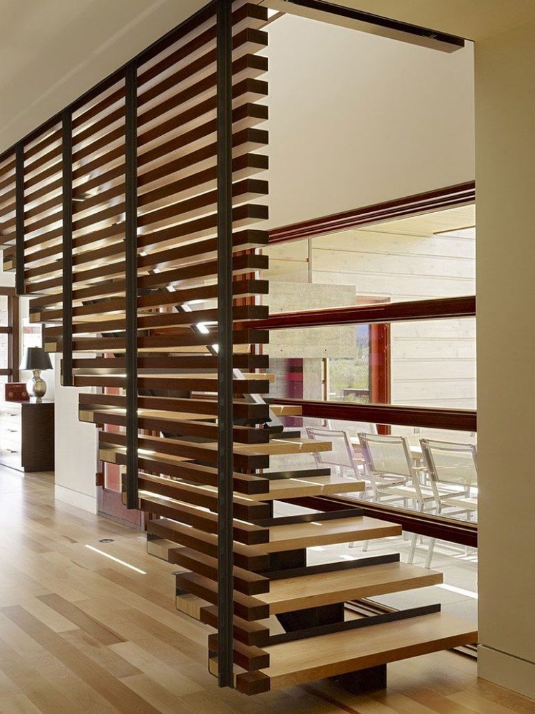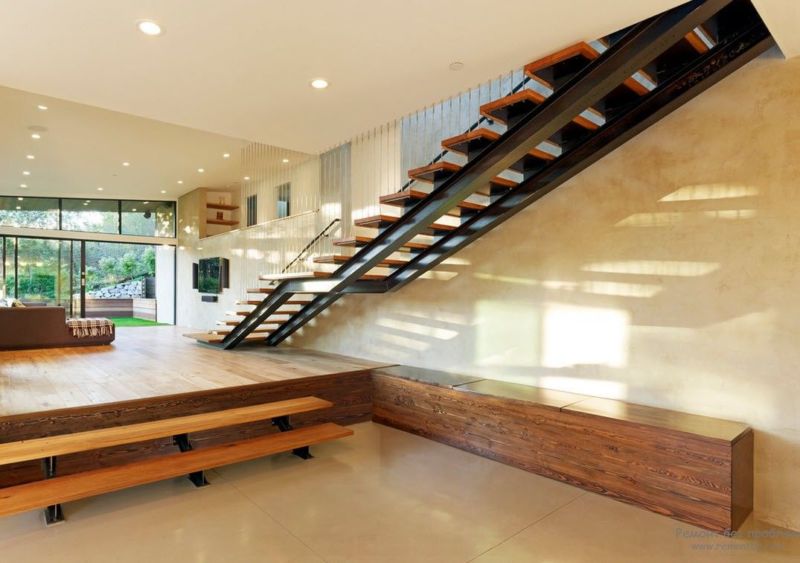 Un escalier de ce style ne devrait pas attirer l'attention. Il forme un tout avec la pièce. Marches sur les furoncles est une excellente solution.