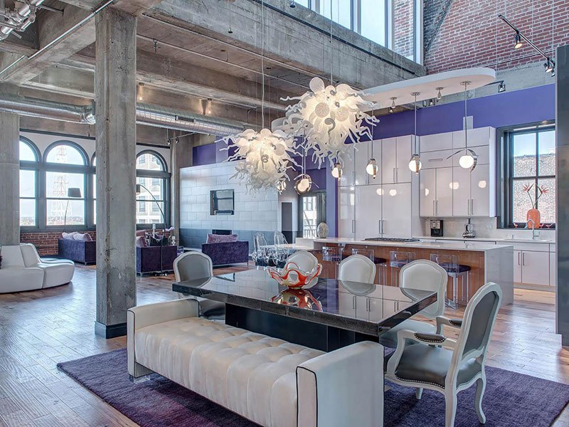 Loft implique l'utilisation de différentes sources d'éclairage. Grâce aux nombreuses lampes, il est possible non seulement d’éclairer la pièce la nuit, mais également de zoner l’espace. Pour ce faire, utilisez des lustres, des suspensions, des lampes à LED et des lampes de sol.