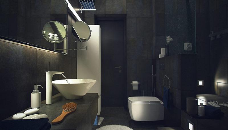 Le design de la salle de bain peut être différent: de la haute technologie à l’éclectisme. Ce sera le bain approprié avec les jambes courbes et la douche. En outre, un évier d'origine ou des étagères en verre sont installés ici.