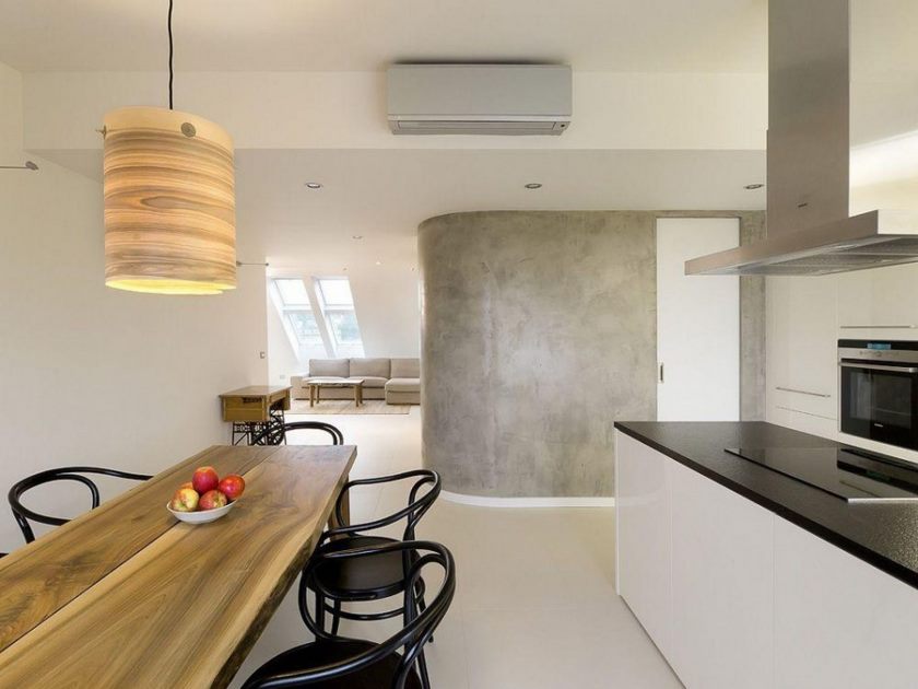 Les hauts plafonds permettent l'utilisation d'éléments industriels (fermes, poutres, boiseries, tuyaux de ventilation). Dans un appartement avec des plafonds bas, vous pouvez utiliser du plâtre, peint à la peinture blanche.