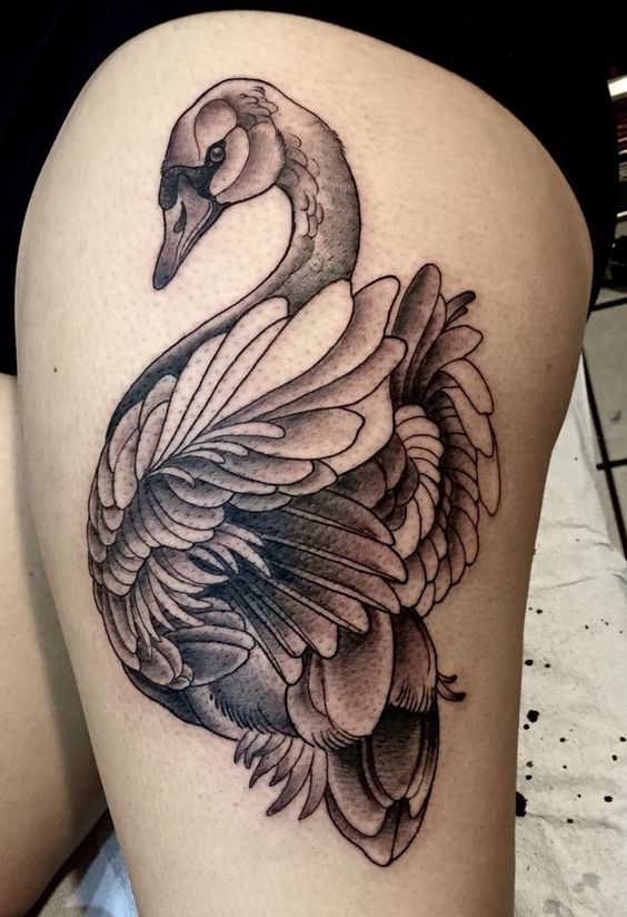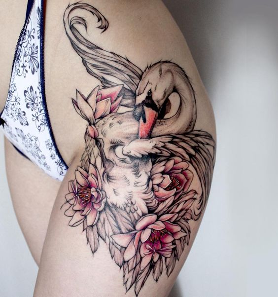 Pureté, amour et fidélité symbolisent le cygne. Les dessins avec cet oiseau sont très demandés par les femmes et les couples amoureux. Après avoir fait un tatouage avec l'image d'un cygne, les amants montrent leur loyauté et leur amour l'un pour l'autre. Les personnes qui font leur choix en faveur du cygne attachent une grande importance à leur famille et à leurs liens en général. Ce tatouage peut être présenté en couleur et en noir et blanc. C’est très à la mode de décorer un tatouage de cygne avec des fleurs, des cœurs et de la verdure.
