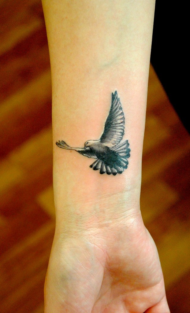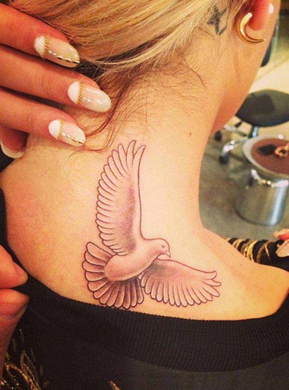 La colombe est reconnue comme le symbole international de la paix, de la bonté, de l'amour, de la fidélité et de la liberté. Dessiner un tatouage sous la forme de cet oiseau épris de paix est devenu courant pour beaucoup de belles femmes, car il symbolise la maternité, la féminité, la tendresse et la paix. Les amoureux qui ne peuvent imaginer la vie l'un sans l'autre sont enclins à choisir l'option de deux pigeons. Une colombe portant une branche d'olivier dans son bec est un symbole d'espoir, mais si dans son bec une branche de palmier sert de talisman à "l'ange de la mort".